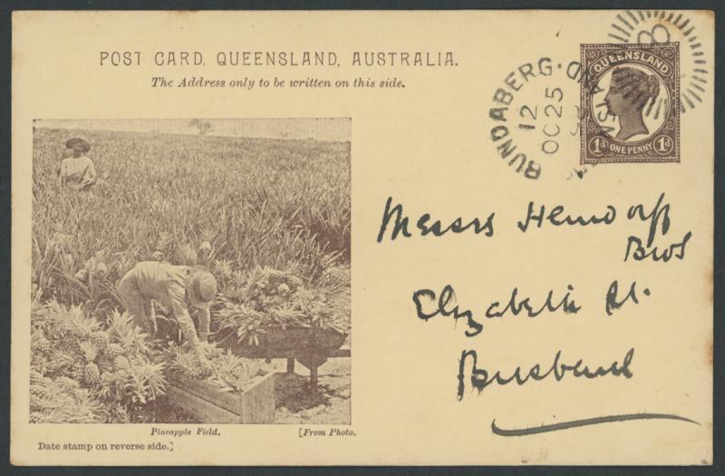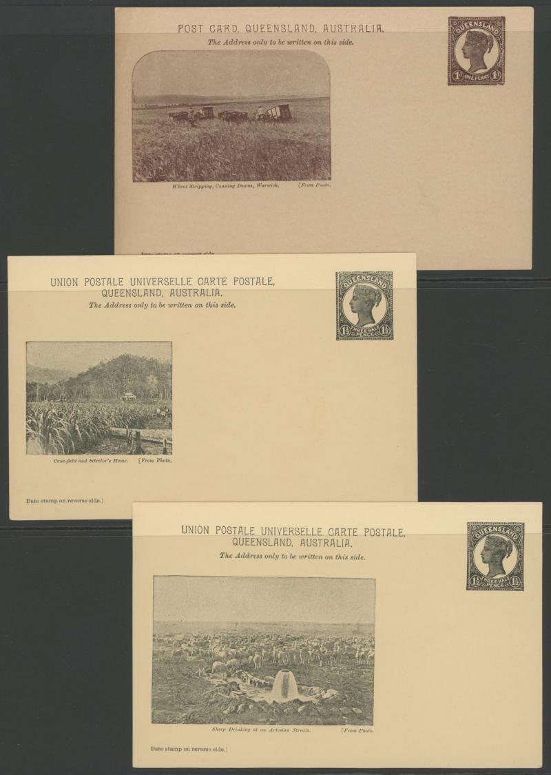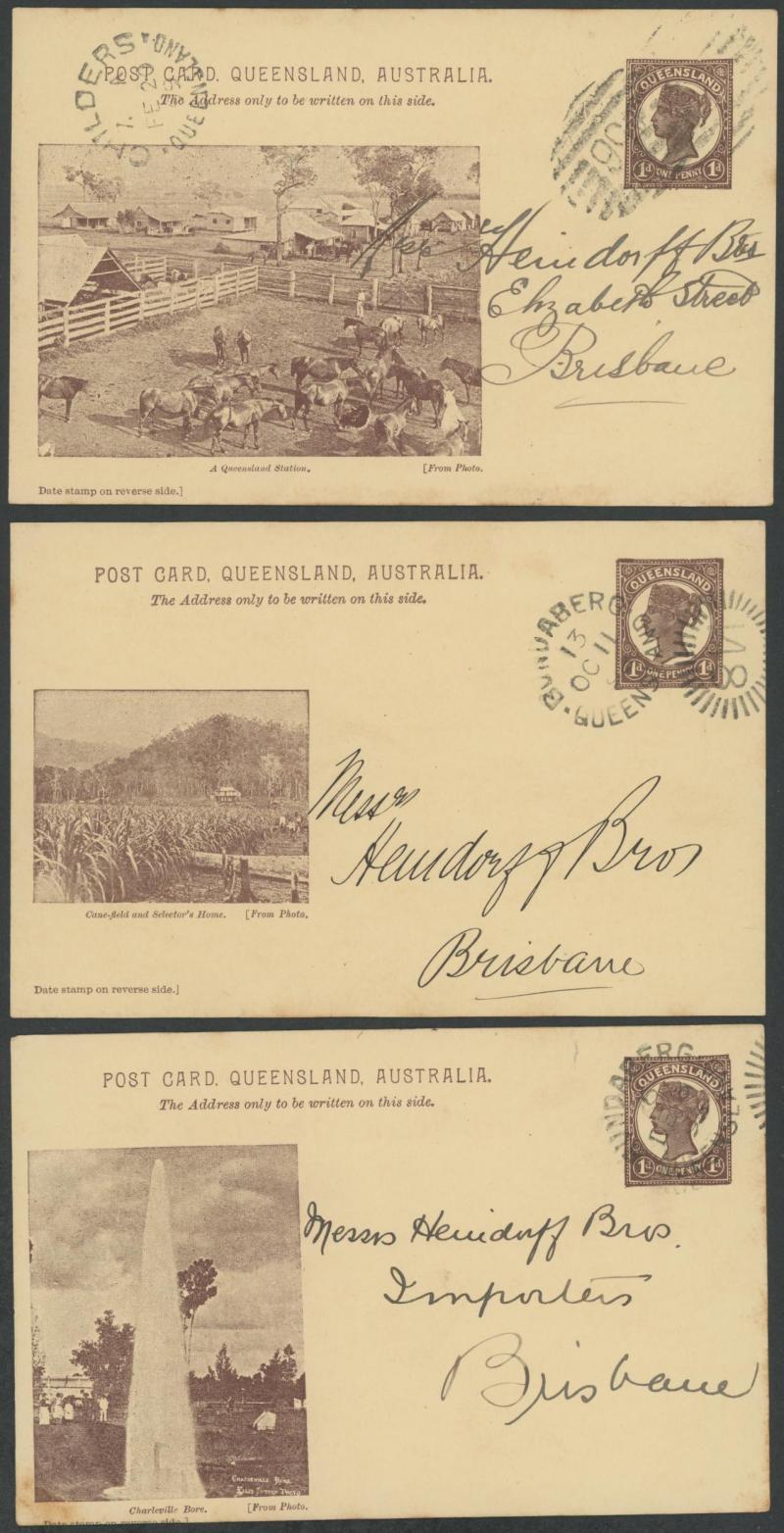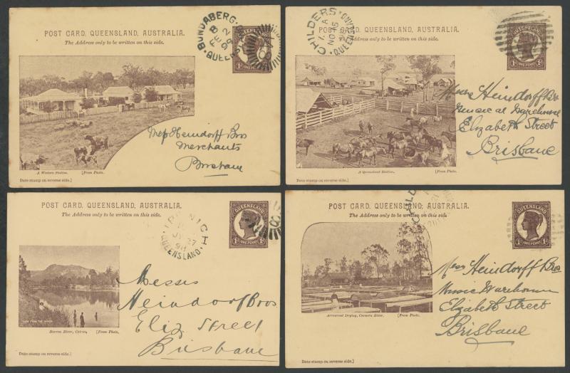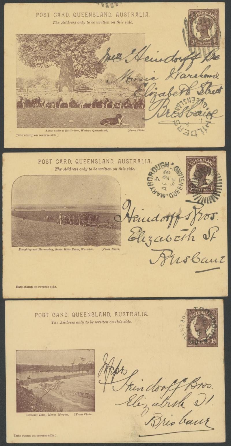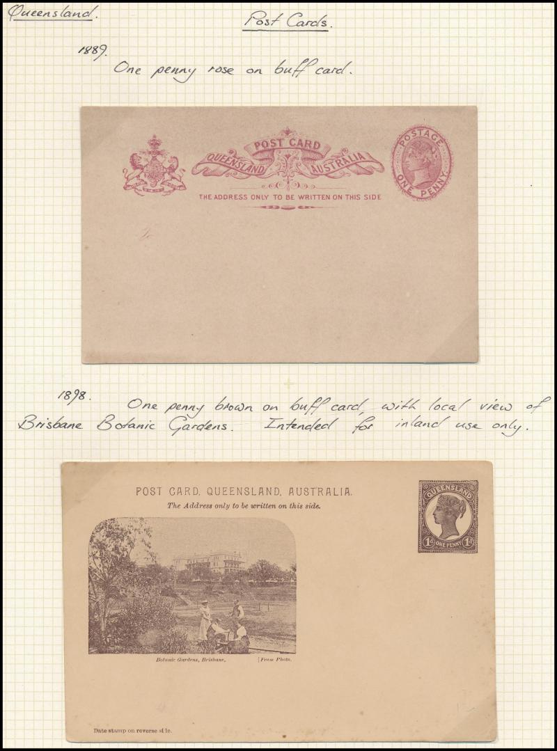 and Works, Charters Towers', 'Plowing and Harrowing, Green Hills Farm, Warwick, ' Hambledon Sugar Mill, Cairns' & 'Brisbane River from Parliament House' (Alan Griffiths: "This card [issue] is among the more scarce items ..."), 1905 QV 1d brown with