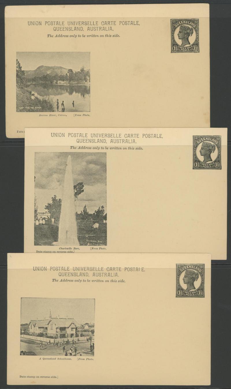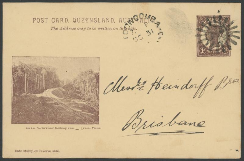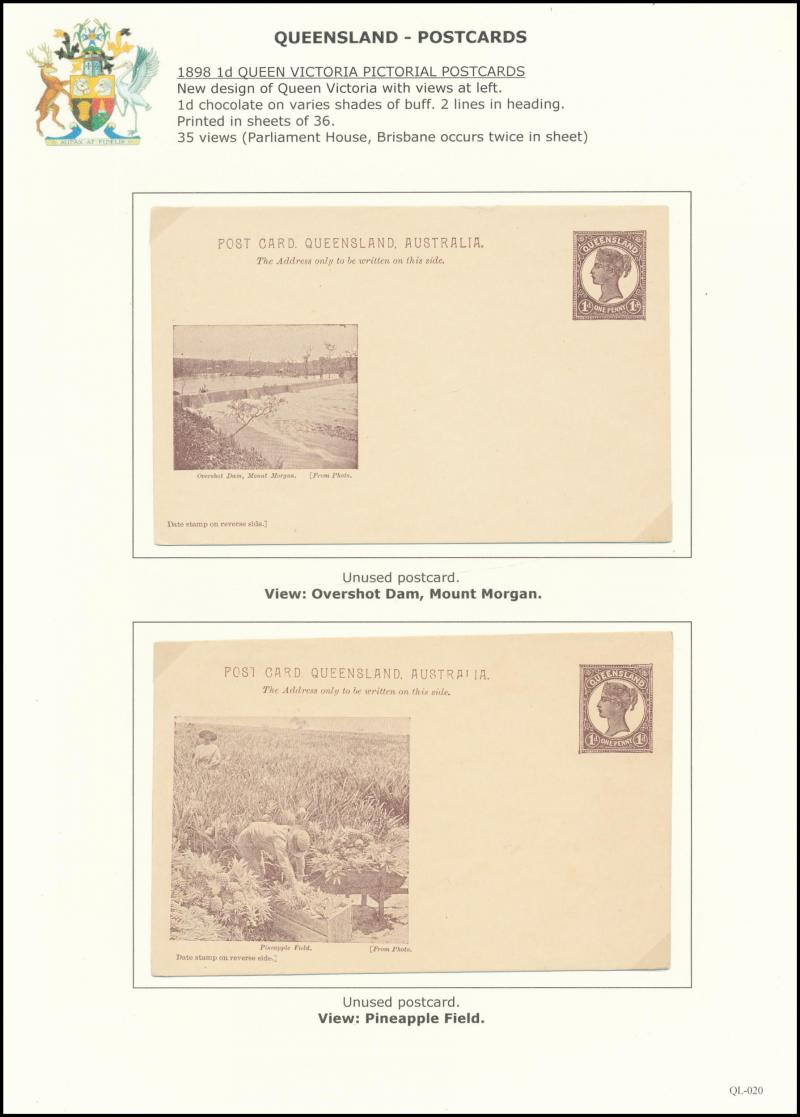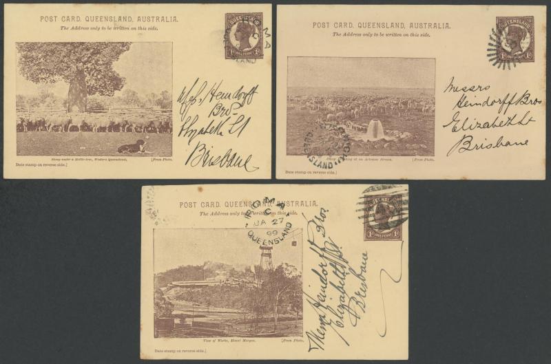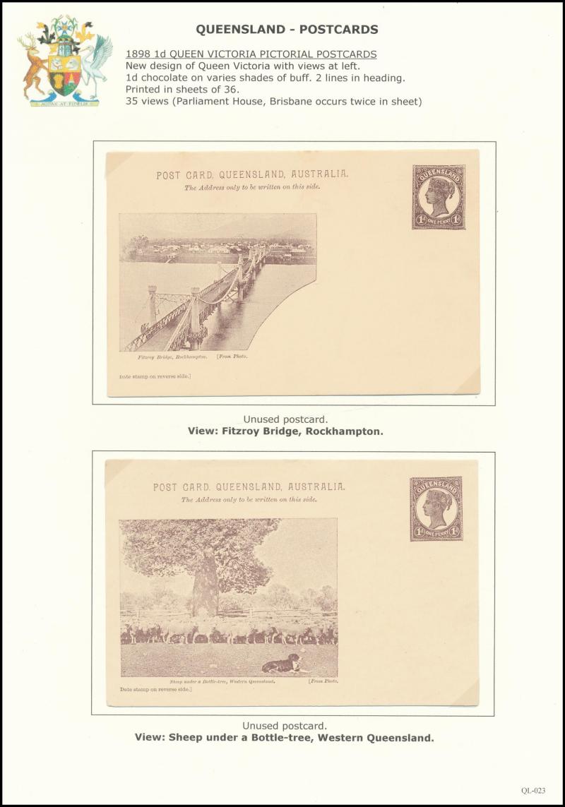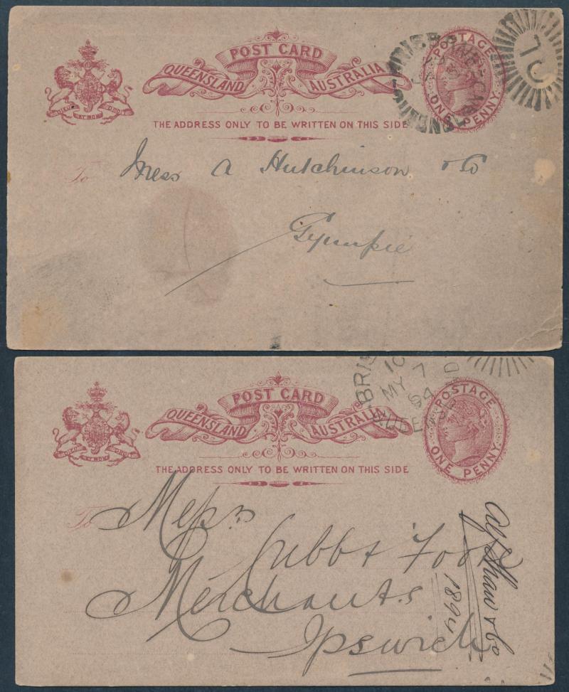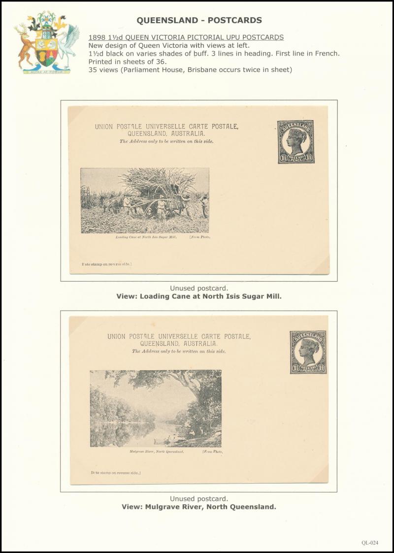 and Works, Charters Towers', 'Plowing and Harrowing, Green Hills Farm, Warwick, ' Hambledon Sugar Mill, Cairns' & 'Brisbane River from Parliament House' (Alan Griffiths: "This card [issue] is among the more scarce items ..."), 1905 QV 1d brown with