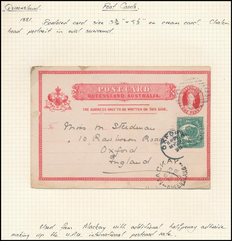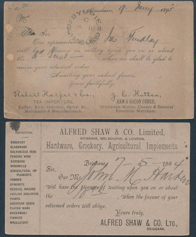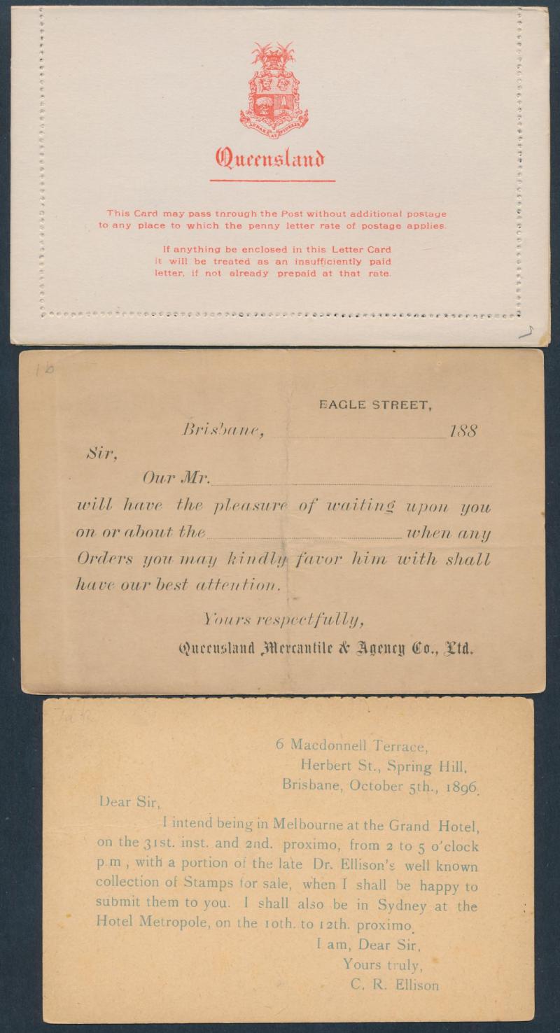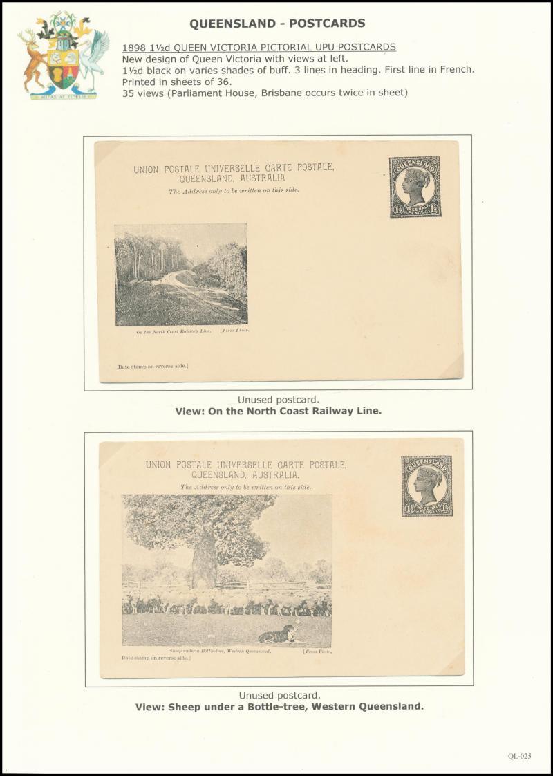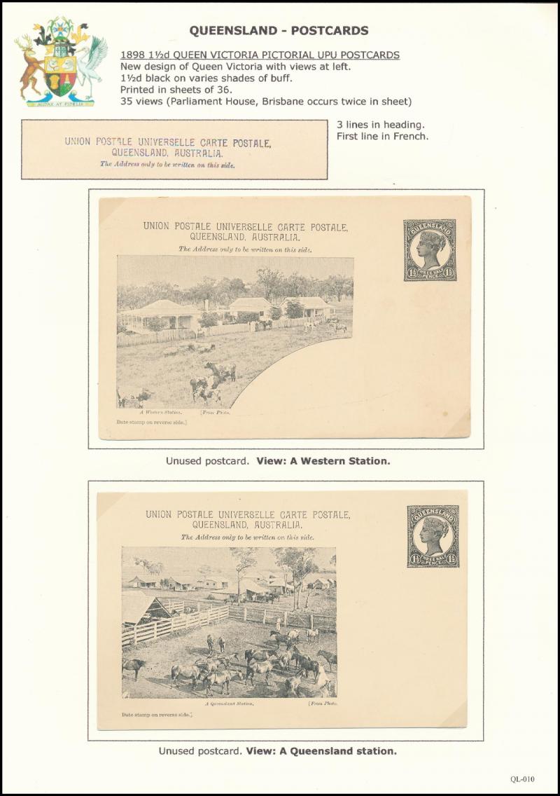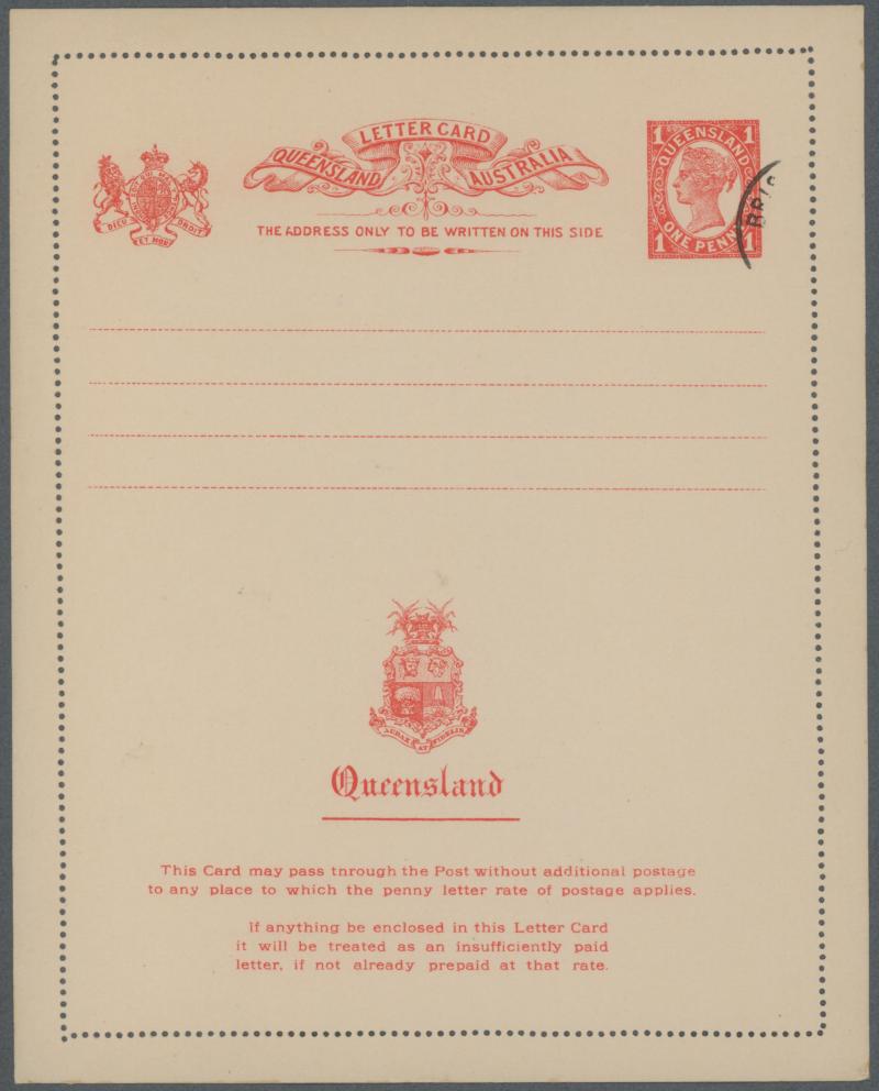 and Works, Charters Towers', 'Plowing and Harrowing, Green Hills Farm, Warwick, ' Hambledon Sugar Mill, Cairns' & 'Brisbane River from Parliament House' (Alan Griffiths: "This card [issue] is among the more scarce items ..."), 1905 QV 1d brown with