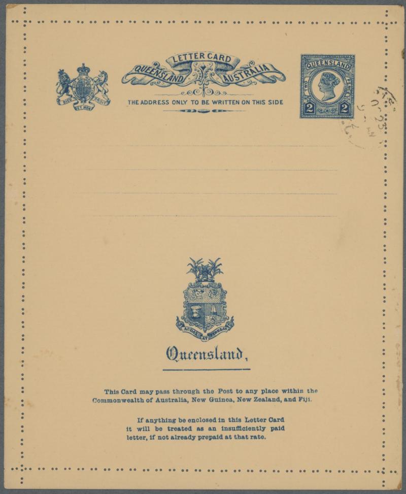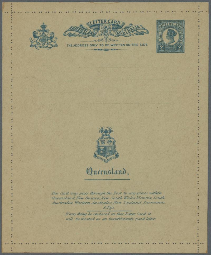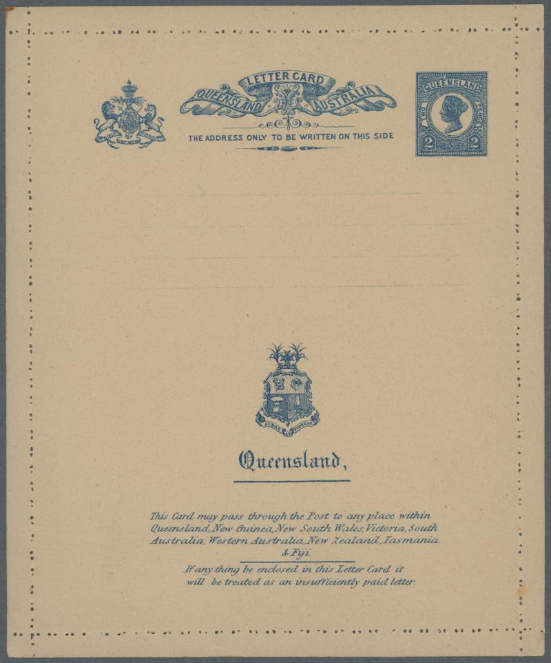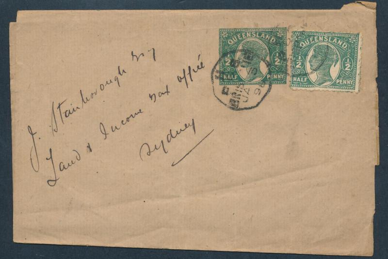 qualifying for the concessional 1d printed matter rate and QV Second Sidefaces 1d tied by Brisbane cds, pinhole at left where secured in transit, a couple of minor hinge remainders on the reverse otherwise superb. The only example we have seen. Sold
