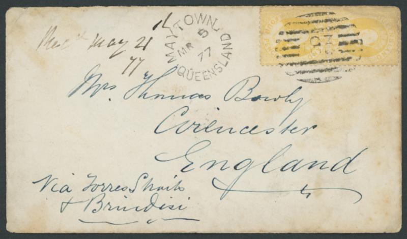 1877 (Mar 5) envelope to Gloucestershire, England endorsed "Via Torres Straits & Brindisi" with the rare franking of QV Chalons