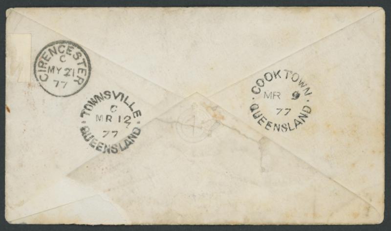 'CIRENCESTER/MY21/77' arrival backstamps, some soiling but still an attractive cover. Maytown was the main town on the Palmer River Goldfield, 1900km NNW of Brisbane & 50km inland from Cape Tribulation, but has been a ghost town since WWII. PO