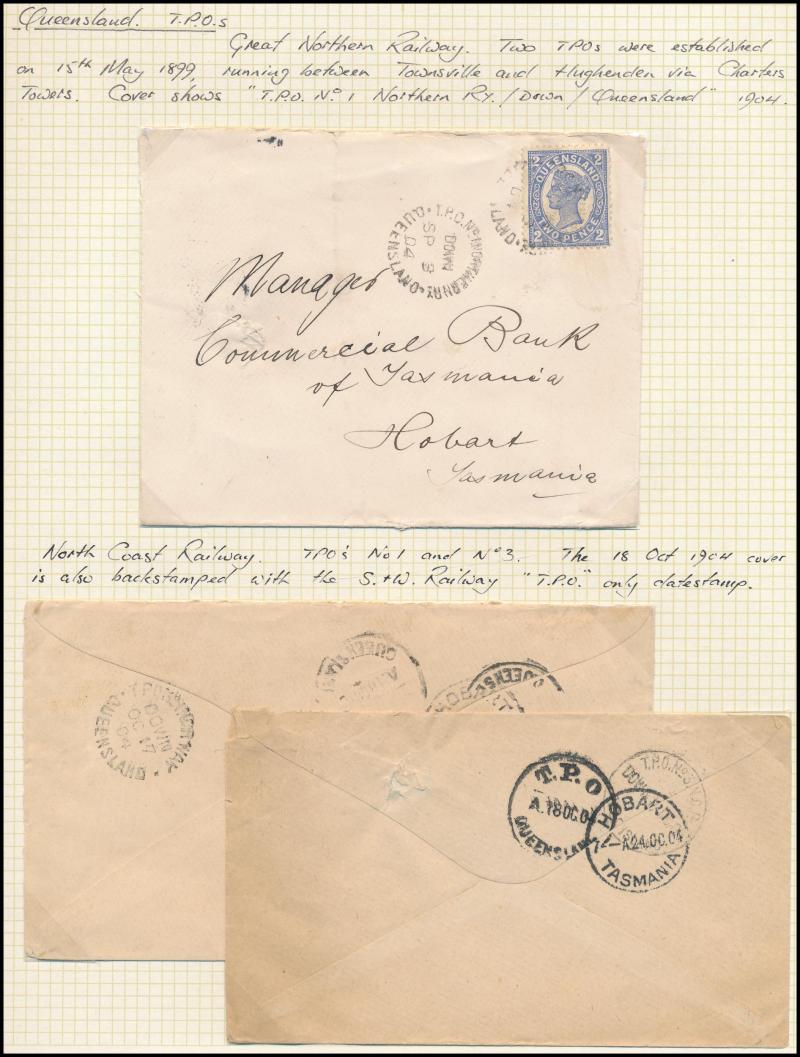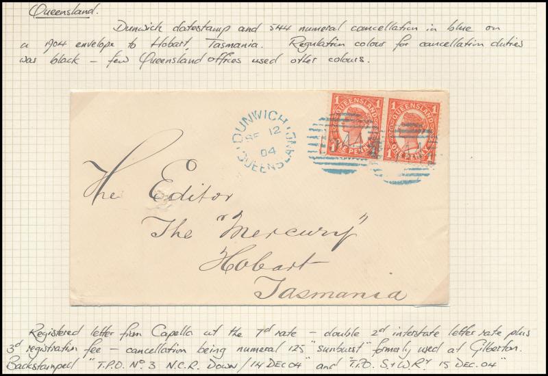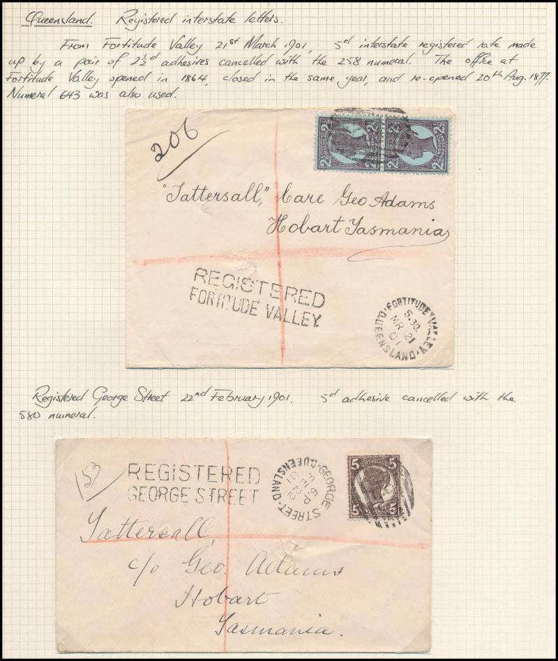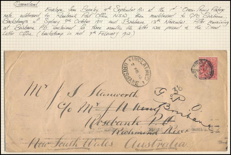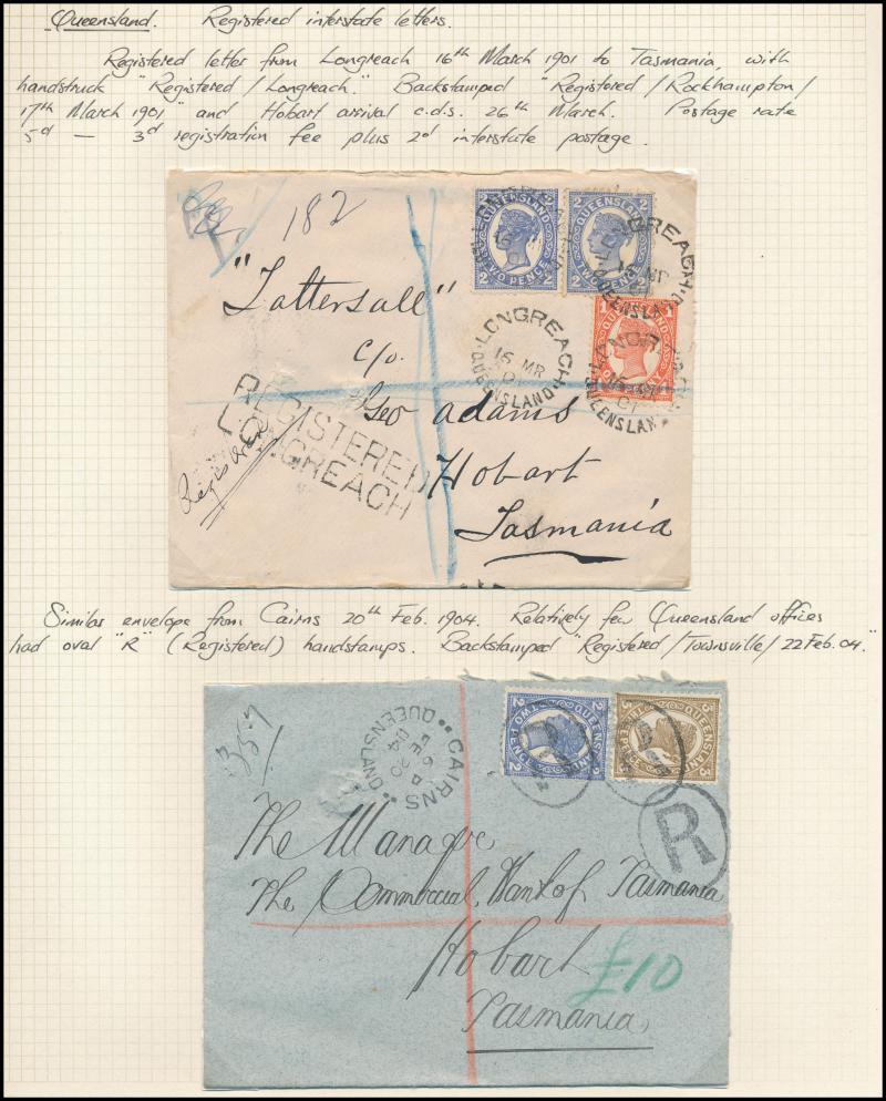 'REGISTERED/...' handstamps from Capella, Fortitude Valley, George Street & Longreach and various TPO markings, taxed items, 1911 from England with 'UNCLAIMED/BRISBANE' oval datestamp, Postal Stationery unused & used, etc, condition a little variable