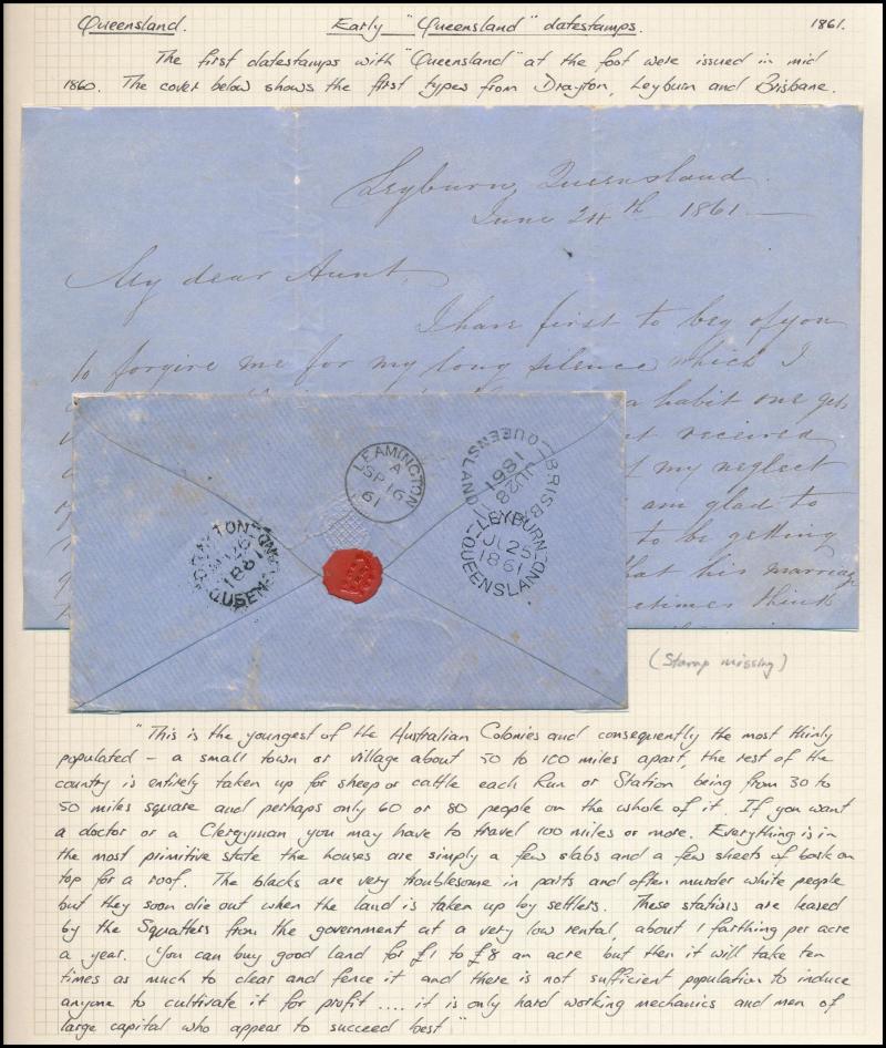 interest noted 'LEYBURN' superb backstamp on 1861 envelope (stamp excised), 1904 Barred Numeral '544' two strikes tied to 'DUNWICH' cds all in blue, 1905 'Aborigines' postcard to Glasgow with ½d & 1d tied 'BAJOOL' cds, Tatts covers with