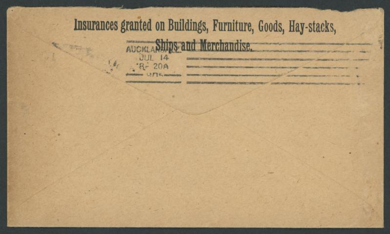 ENVELOPES - STAMPED TO ORDER: 1905 usage of QV Sidefaces White Background 2d blue HG KB5 on buff stock for New Zealand Insurance Co