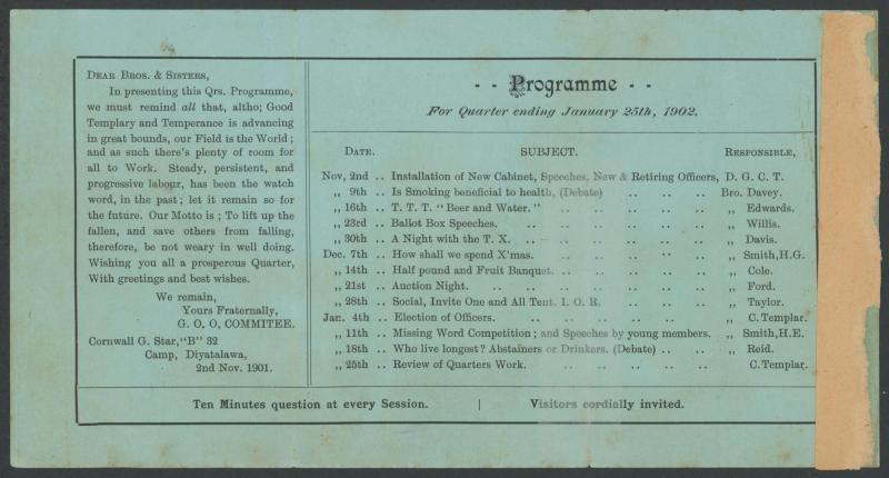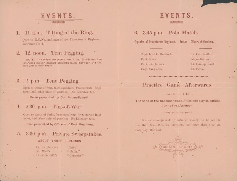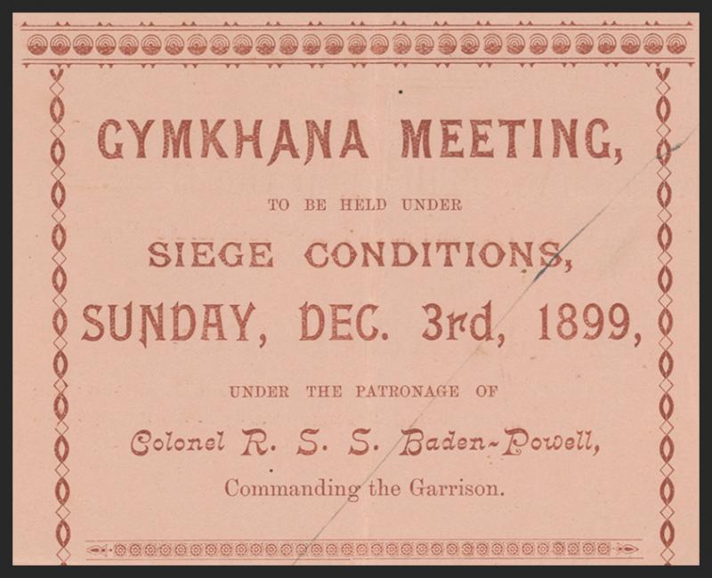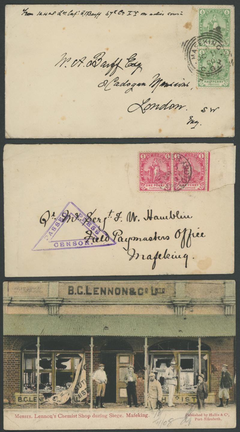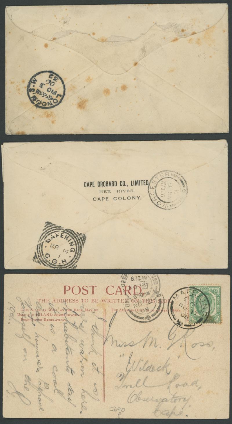 Yeomanry with Cape ½d pair tied by 'MAFEKING/CGH' squared-circle; 2) 1901 to "Field Paymasters Office/Mafeking" with Cape 1d pair tied by light 'HEX RIVER' cds, superb arrival backstamp; 3) 1899 (Dec 3) brown/pink programme for 'Gymkhana Meeting/to