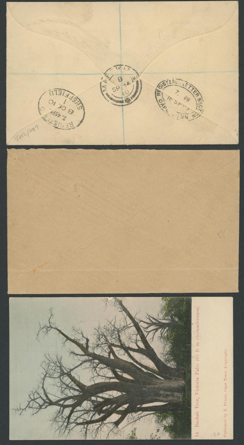 POSTAL HISTORY: Mafeking group with 1906 PPC and 1910 & 1911 covers with boxed R cachet in red or violet, Fournier forgeries of the