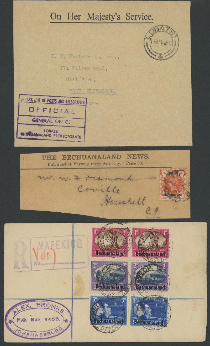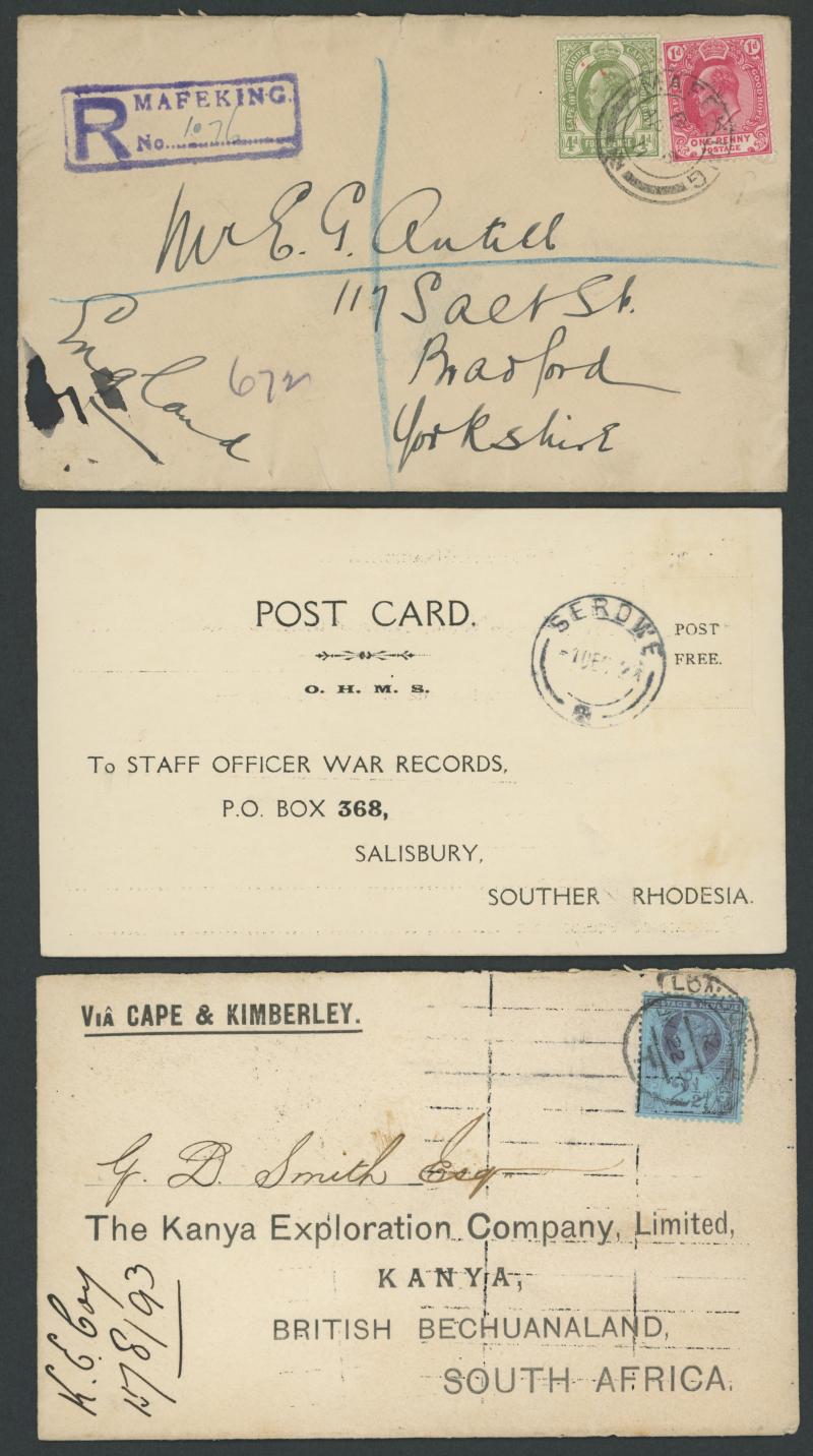 'MAFEKING/1d/BESEIGED' & similar '6d' surcharges; and Bechuanaland 1921 OHMS postcard from 'SEROWE', 1935 OHMS air to Boshof with Jubilee 3d tied by 'BECH PROT/HO MAFEKING' cds, 1893 from London to 'Kanya Exploration Company/Kanya/British