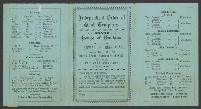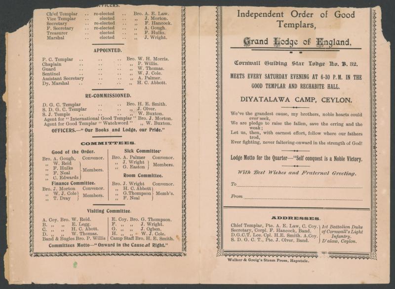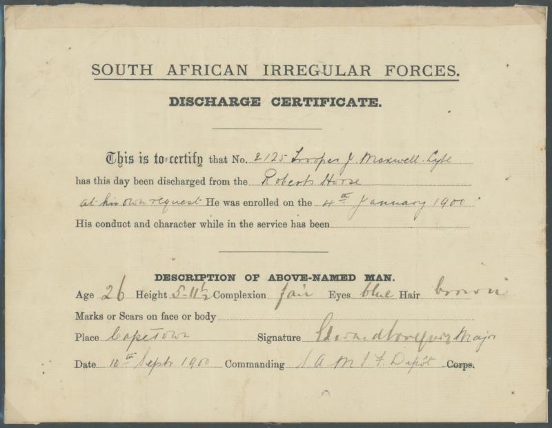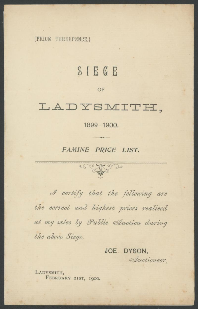 Diyatalawa Ceylon; 1900 South African Irregular Forces 'Discharge Certificate'; and a few others, condition variable, plus 1899 4pp pamphlet 'Siege/of/Ladysmith/.../Famine Price List' including such extortionate entries as 10/- for a tin of condensed