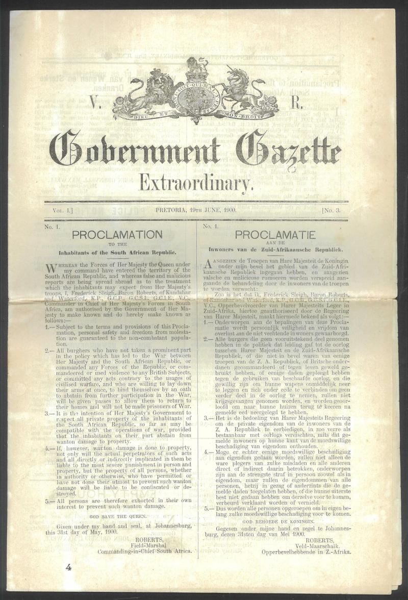 EPHEMERA: Boer War group with 1900 (June 19) Government Gazette Pretoria with Lord Roberts' Proclamation re Treatment of Boer