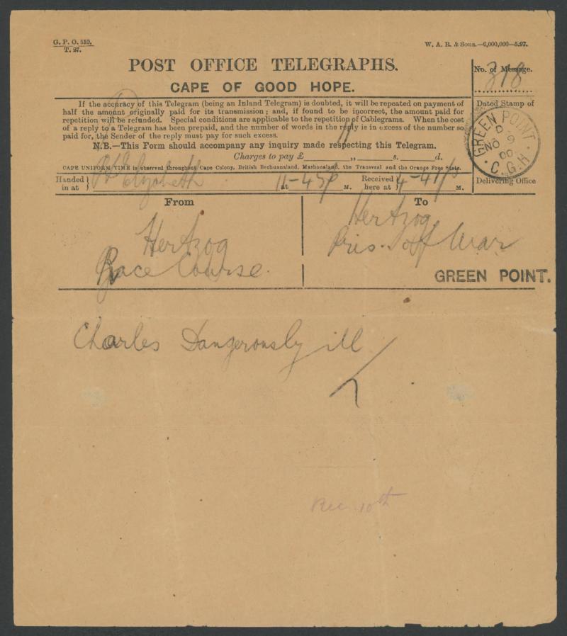 Civilians etc, remarkably fine; 1900 telegram to a Boer POW with 'GREEN POINT' arrival cds; 1901 Union Castle Line red/white 'Plague Restriction...' slip; newspaper cutting of Boer POW soccer team in Ceylon; photograph of Boers in masonic regalia at