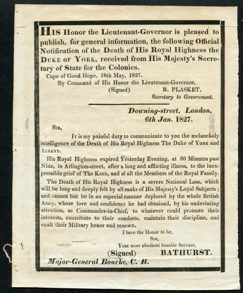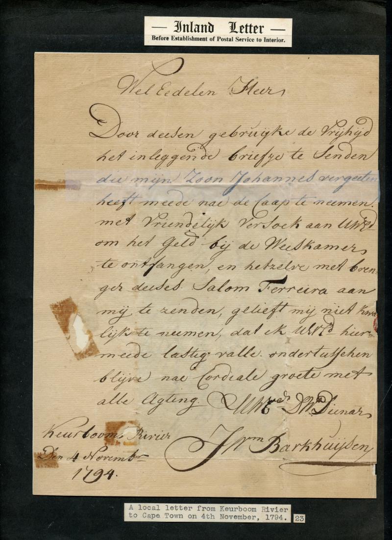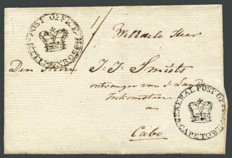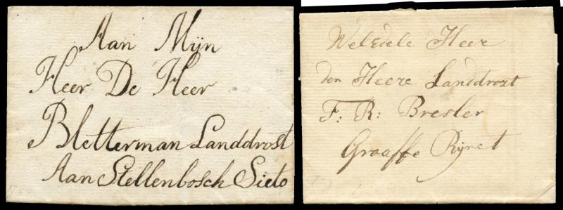 entire from Keurbooms Rivier to the Cape before inland postal services were established; very fine 1796 outer to "Graaffe Rijnet"; early undated outer to Zonnebloem; 1827 official mourning notice re death of the Duke of York; 1836 & 1840 outers from