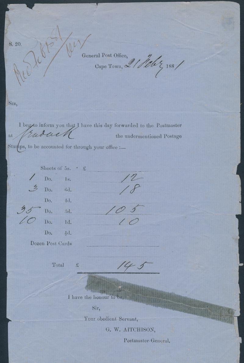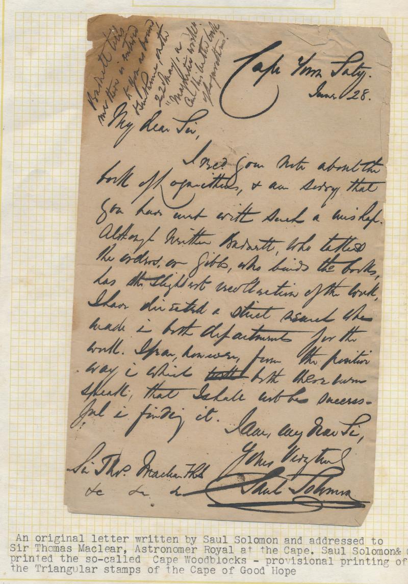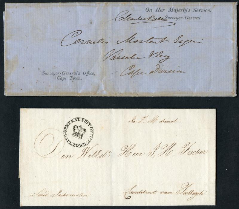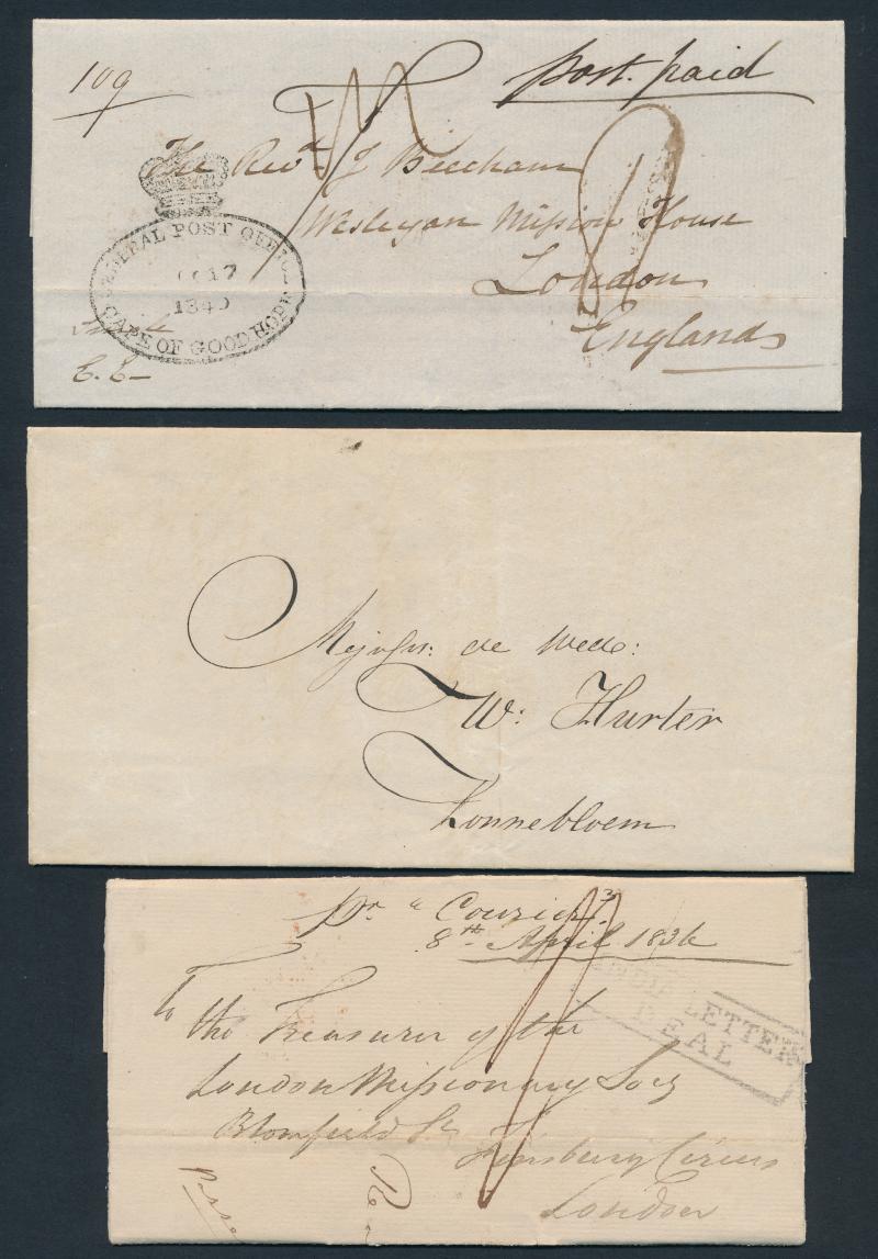 missionaries to London; undated defective letter signed "Saul Solomon [& Co]" printers of the famous 'Woodblocks"; two very fine outers with Crown handstamp, the first from GPO to Tulbagh, the other 'POST OFFICE/STELLENBOSCH' with GPO arrival on the