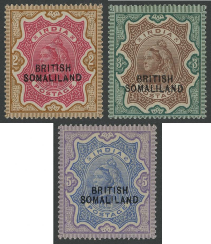 1903 'BRITISH/SOMALILAND' Low Overprints on India QV 2r carmine & yellow-brown, 3r brown & green and 5r ultramarine & violet SG
