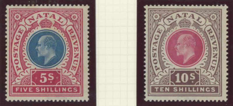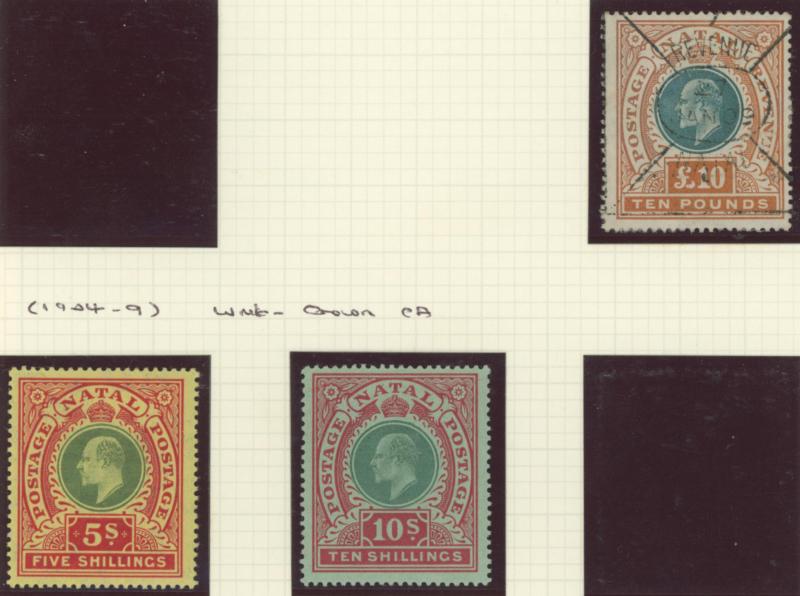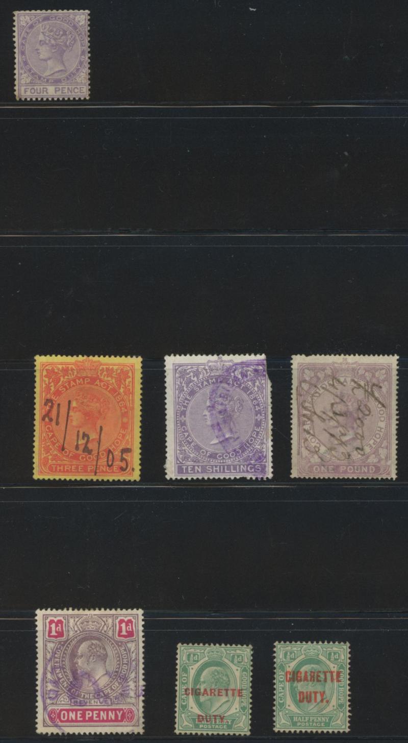 'POSTAGE' Overprint on Fiscal 1/- purple-brown used, 1874-99 QV Crown CC Wmk 5/- rose * (a couple of aged perf tips) and 5/- carmine * (very lightly mounted) & used, 1902 KEVII Heads 'POSTAGE/REVENUE' Crown CA Wmk 2/-, 2/6d & 4/- * plus 4/-
