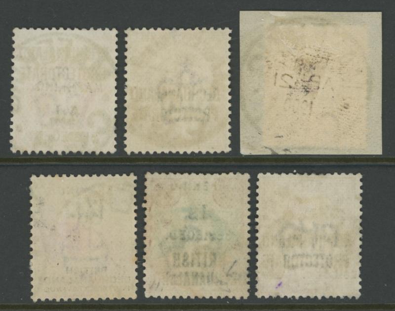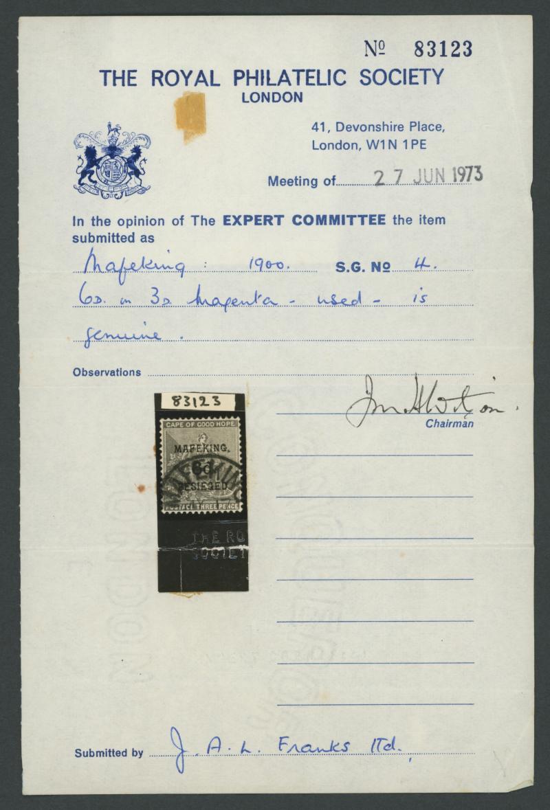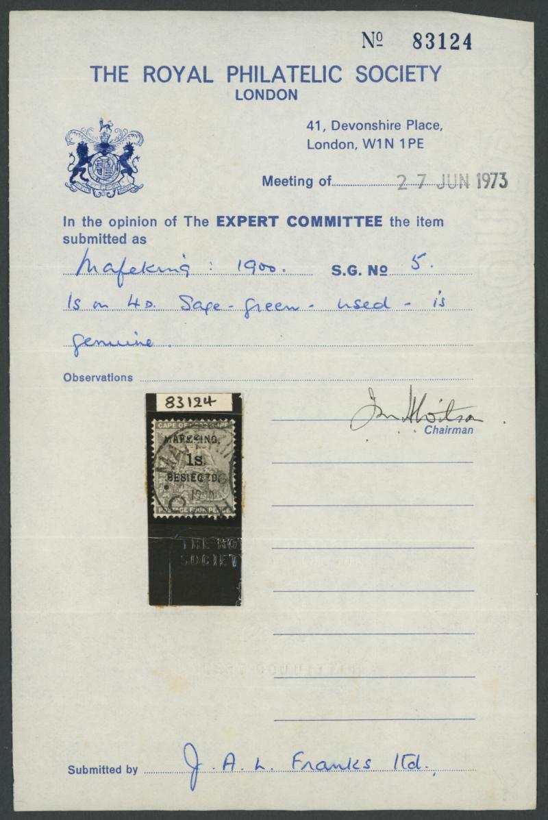 large-part 'MAFEKING/C.G.H' cds cancels, the '1d' & '3d' on Hope Standing both on small pieces, Cat £1190. RPSL Certificate (1973) for the '6d' & '1s'. (5) (Image1) (Image2)