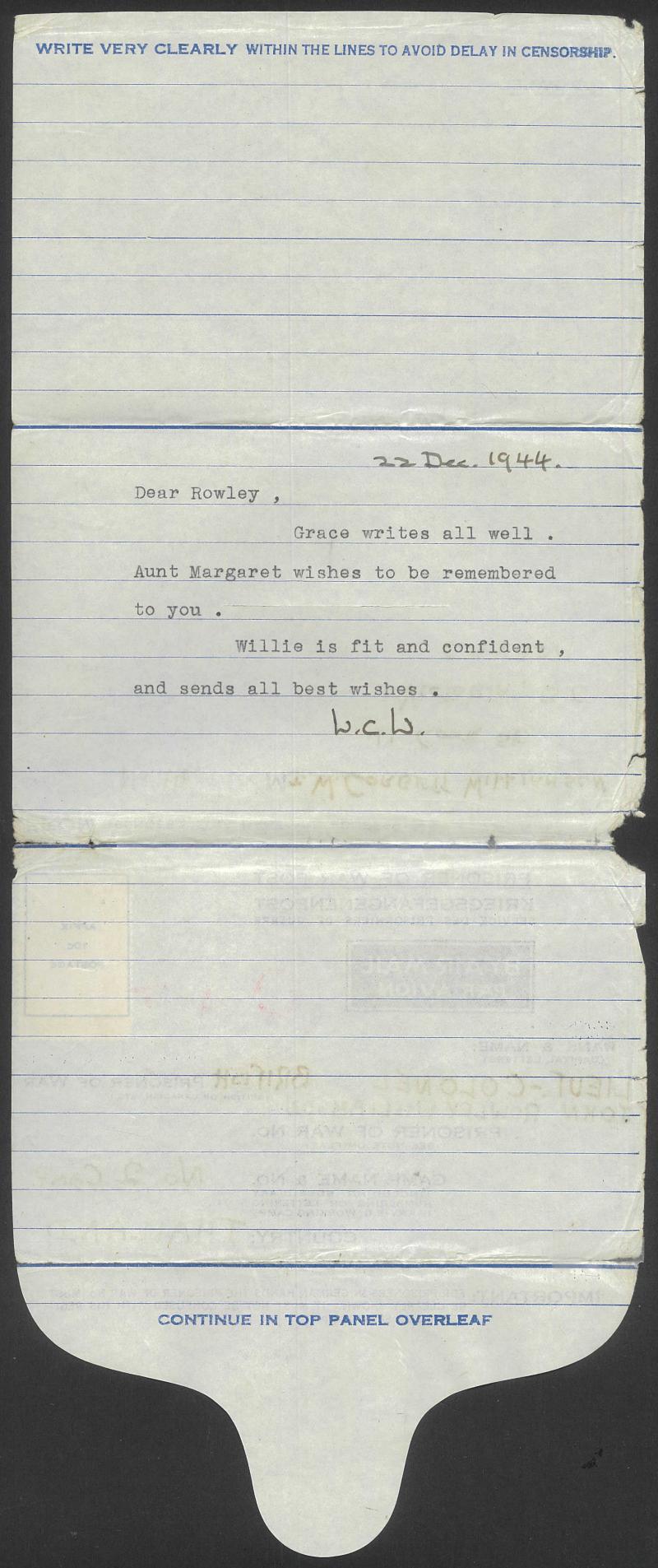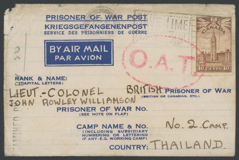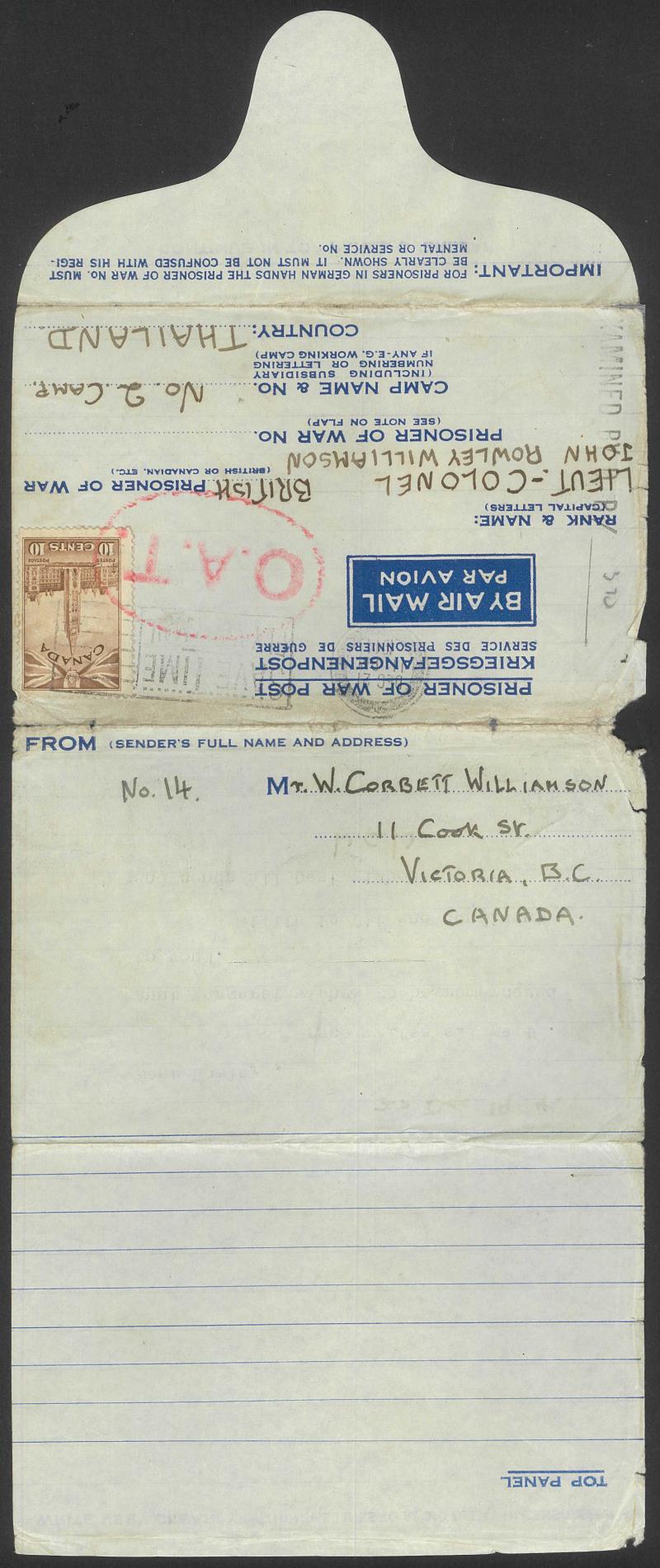 1944 (Dec 21) Japanese Occupation Chungkai (Number 2) Prisoner of War Camp formular Canadian POW airletter with 10c Parliament tied