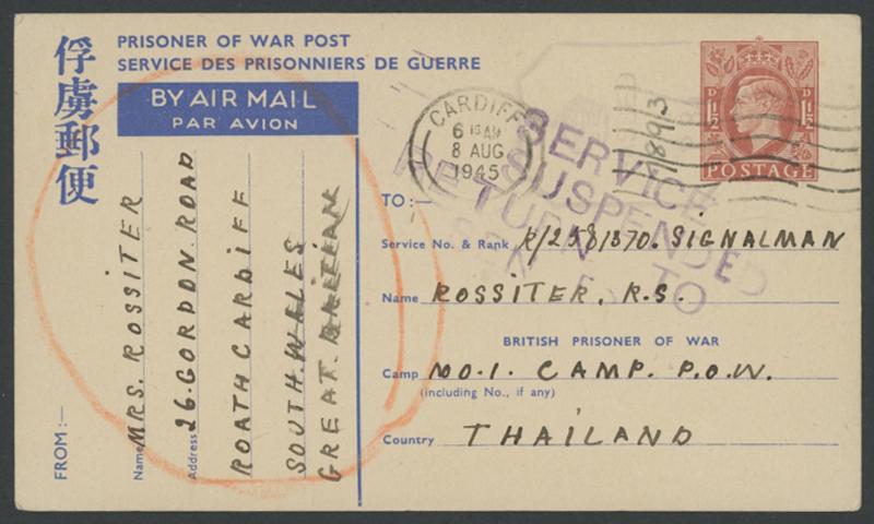 Camp POW/Thailand" from Wales with Cardiff machine, largely very fine 'SERVICE/SUSPENDED/RETURN TO/SENDER' cachet in violet. The absence of a British censor suggests this card did not leave Britain. (Image1) (Image2)