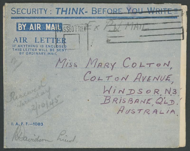 "RDavidson Lieut" at lower-left, to Brisbane with Australian undated 'PASSED FREE' security machine presumably applied at Brisbane, endorsed "Received/2.10.45", a little worn. The lengthy letter states "...We have not yet moved from our camp 15 miles