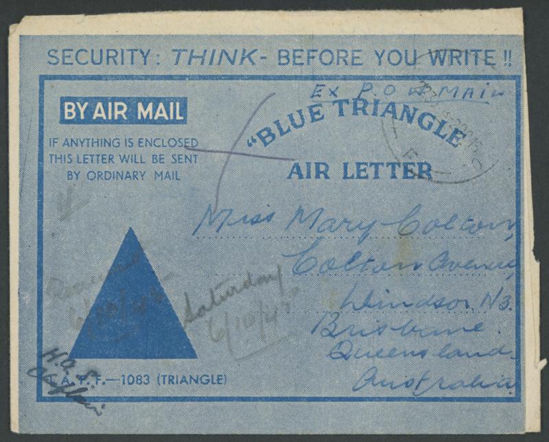 1945 (Oct 9) Indian-pattern Forces Triangle Air Letter headed "POW Reception Depot/Bangalore India", endorsed "Ex POW Mail" and