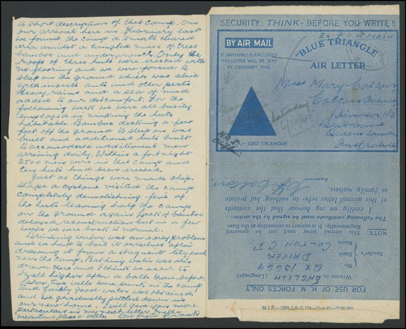 countersigned "HAS/Chaplain" at lower-left, to Queensland with '[No 3 AUST BASE P]O/2OC45/ F ' used at Brisbane, endorsed "Saturday/6.10.45", a little worn. The lengthy letter states "...We are still in the same camp awaiting our move to