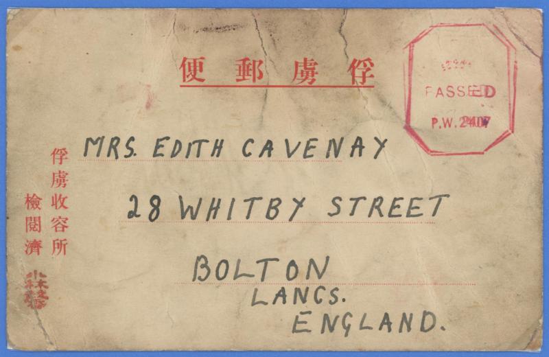 1943-44 four Japanese postal cards from British Gunner John Cavenay to England comprising 1) First Type with Four Characters in Red