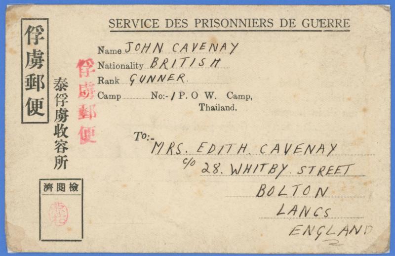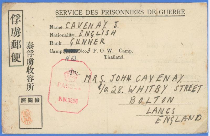 British censor in rosine, to "Thailand No 4 POW Camp" endorsed "Tamuan" in red pencil, han of Ishikura in rosine. Lindsay Chitty states it is likely that Lt Charley actually received this at the Kanchanaburi Officers' Camp. (Image1) (Image2)
