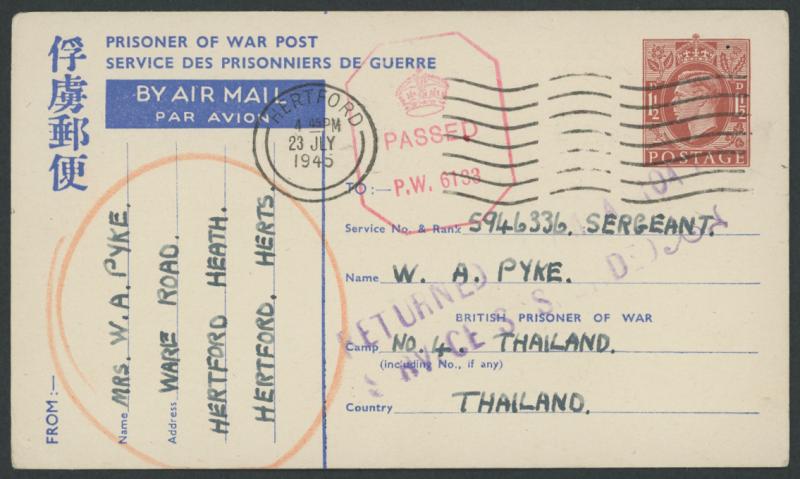 1944 (May 29) British 3d POW Airmail Postal Card from Hertford with British censor in rosine, to "No 4 POW Camp Thailand" endorsed