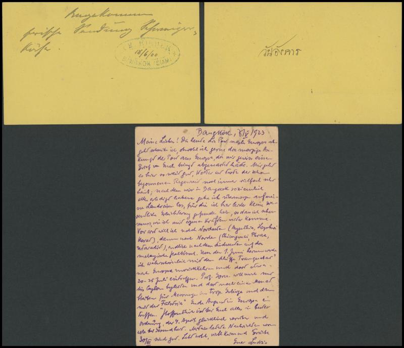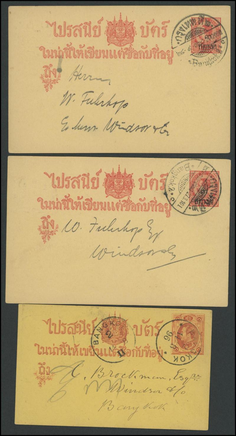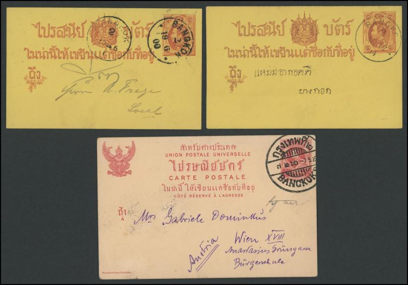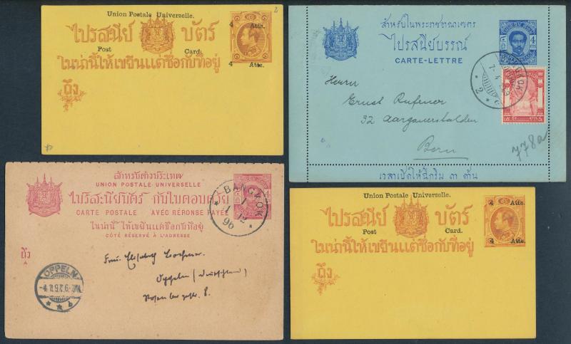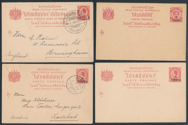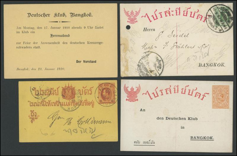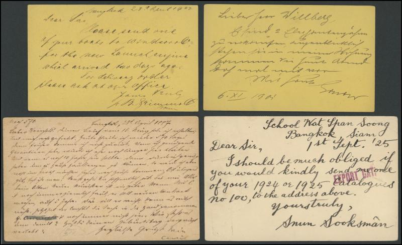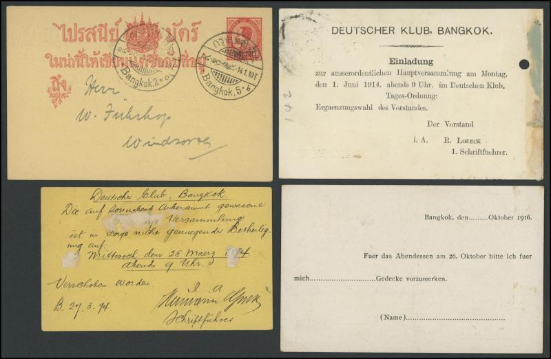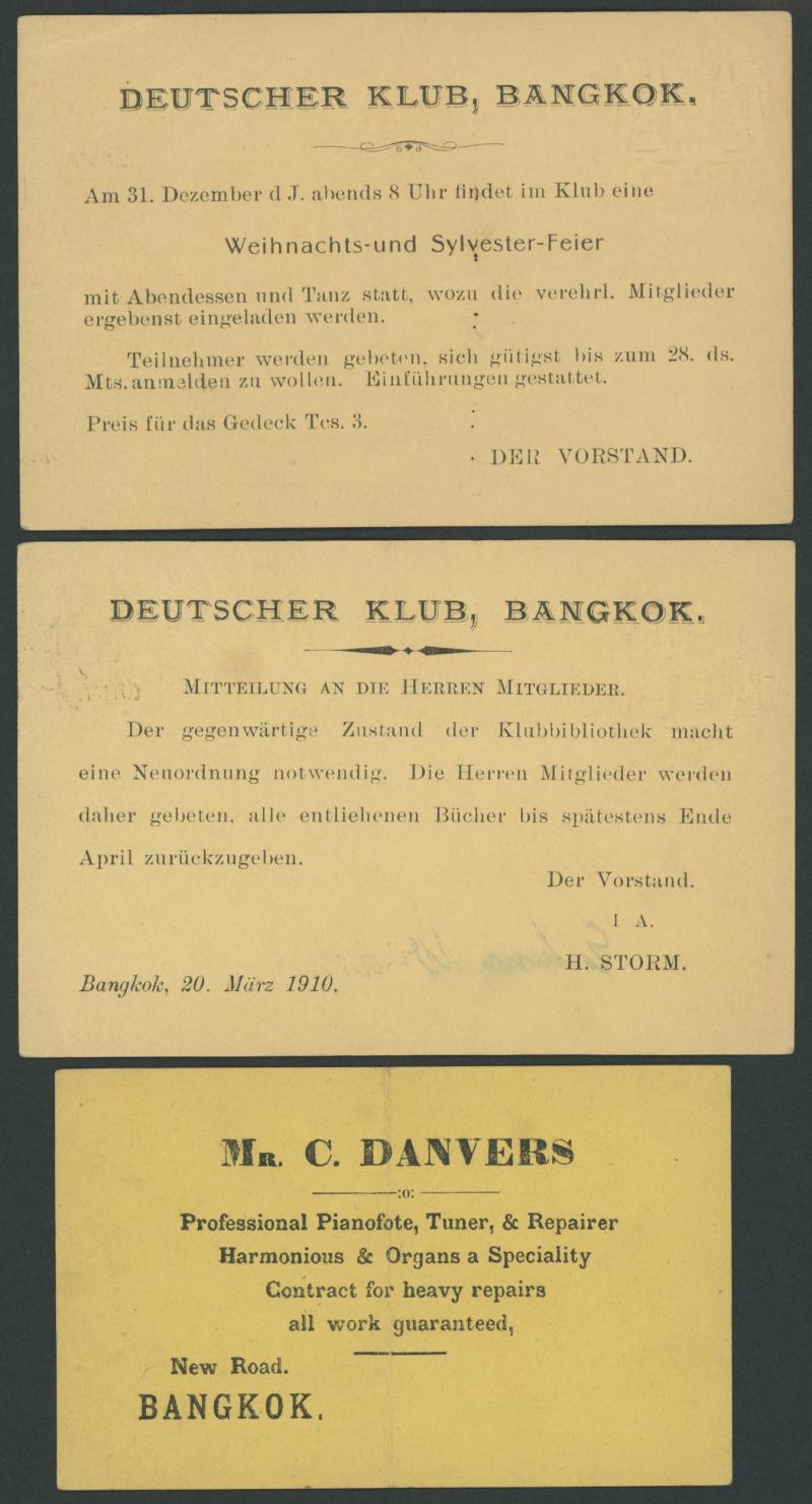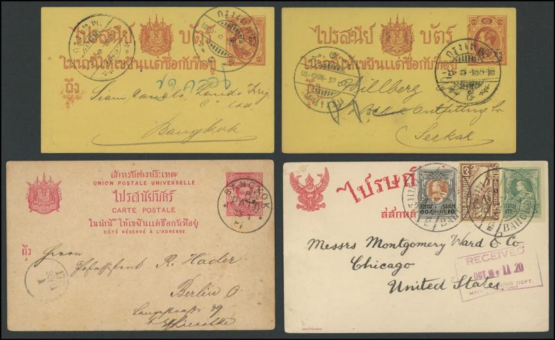 1887 4att to Germany with 'BANGKOK/ P /PAID' cds, 1917 3stg to Montgomery Ward uprated with 2stg & 10stg (message headed "School Wat Span Soong"), issues with various printed advices for C Danvers (Piano Tuner etc) or Deutscher Klub from 1909-10