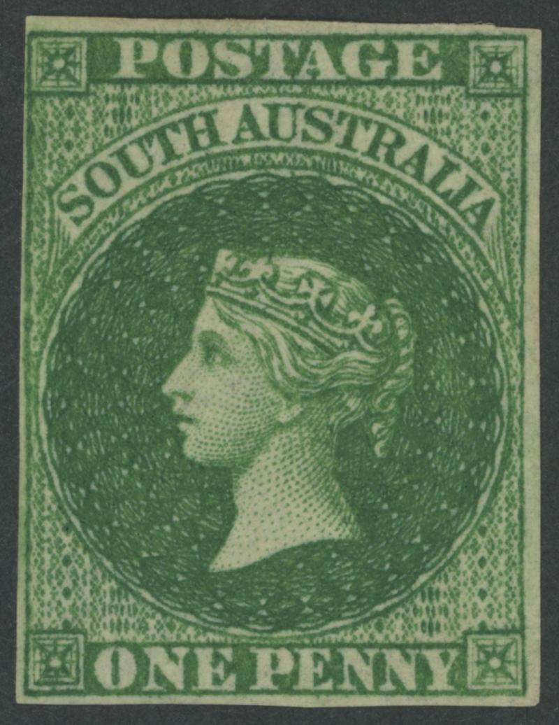 1855 QV Perkins Bacon London Printings Large Star Watermark 1d dark green SG 1, margins just clear - at upper-left - to good,