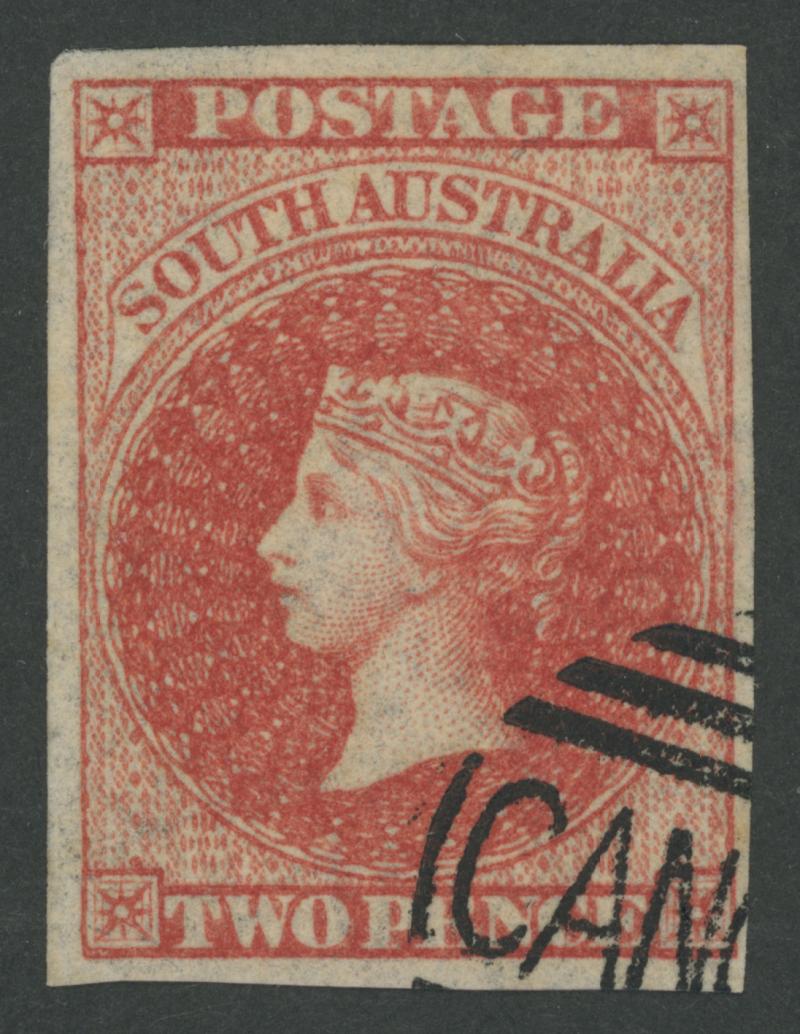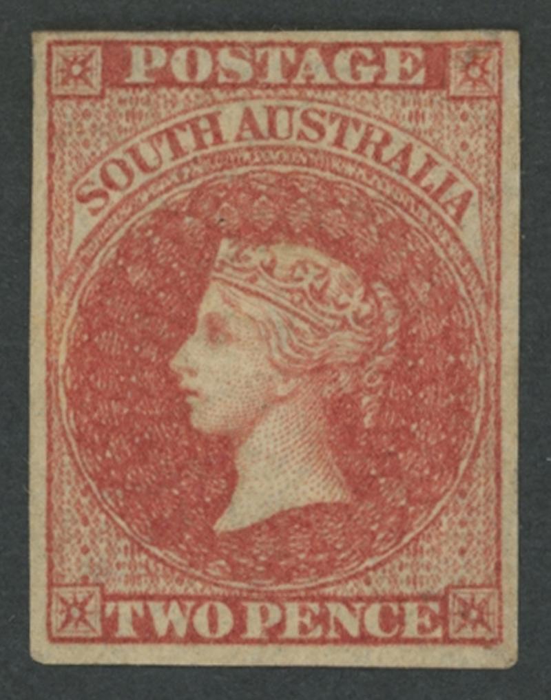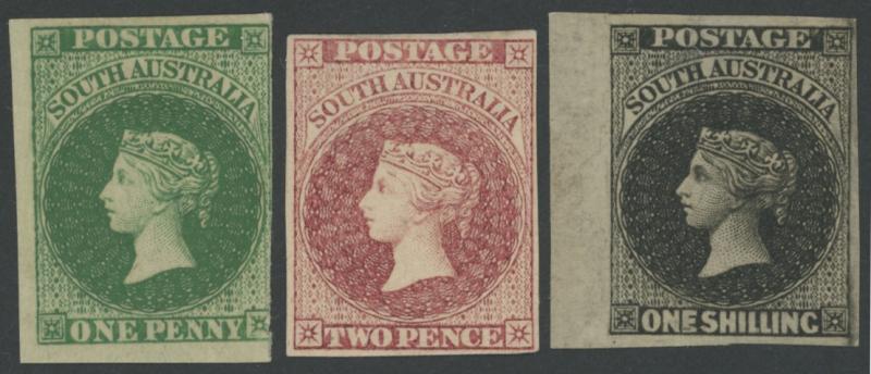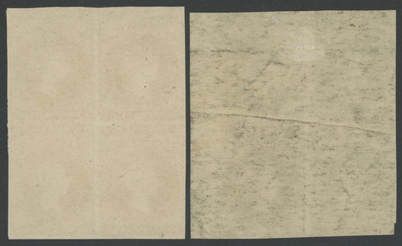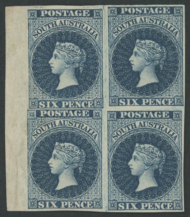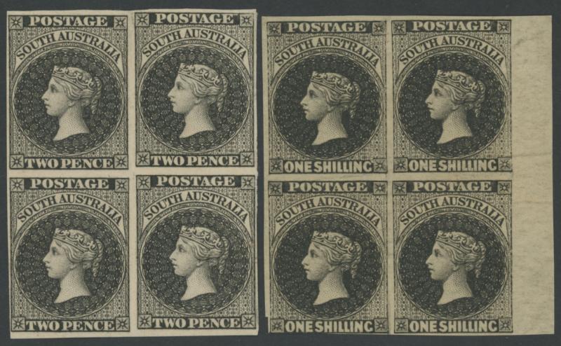 (close to the issued colour) with margins just shaved at lower-right to large; 2d Plate 2 single in dull carmine-lake with margins close to good; 6d block of 4 in deep blue (close to the issued colour) with margins just touching at upper-left to