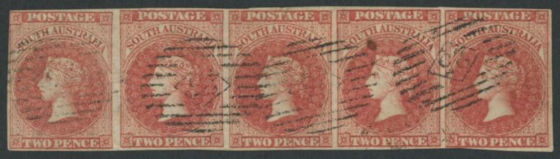 1855 QV Perkins Bacon London Printings Large Star Watermark 2d rose-carmine SG 2 horizontal strip of 5, virtually full margins