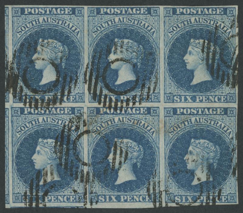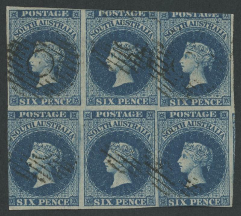 fragment of the adjoining unit at lower-left & chunks of both adjoining units at left, circle-in-bars cancels of Adelaide, Cat £1080+ for singles. A rare, and remarkably fine, block. Ex Michael Blake: sold at our auction of 7.2.2014 for $3145 (Sale