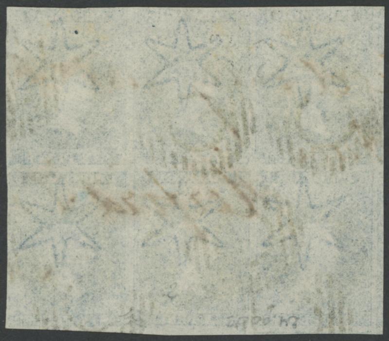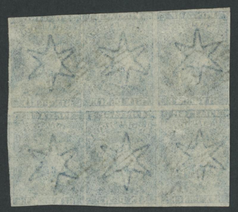 1855 QV Perkins Bacon London Printings Large Star Watermark 6d dark blue SG 3 block of 6 (3x2), margins close to very large with a
