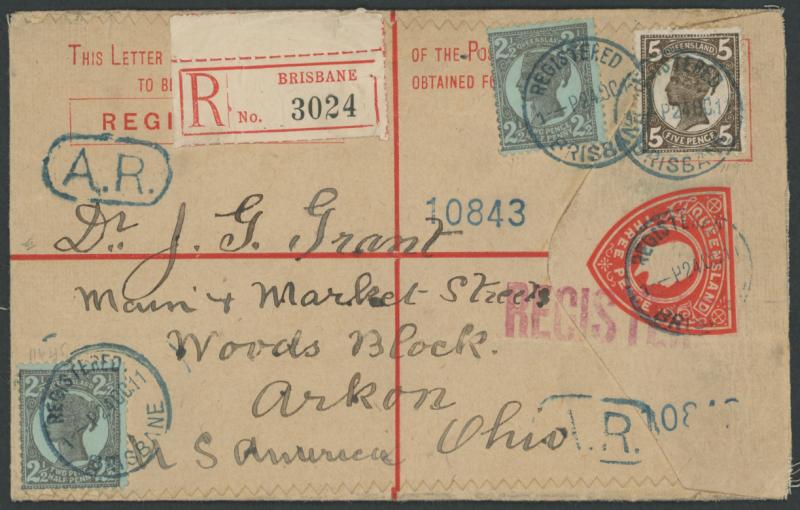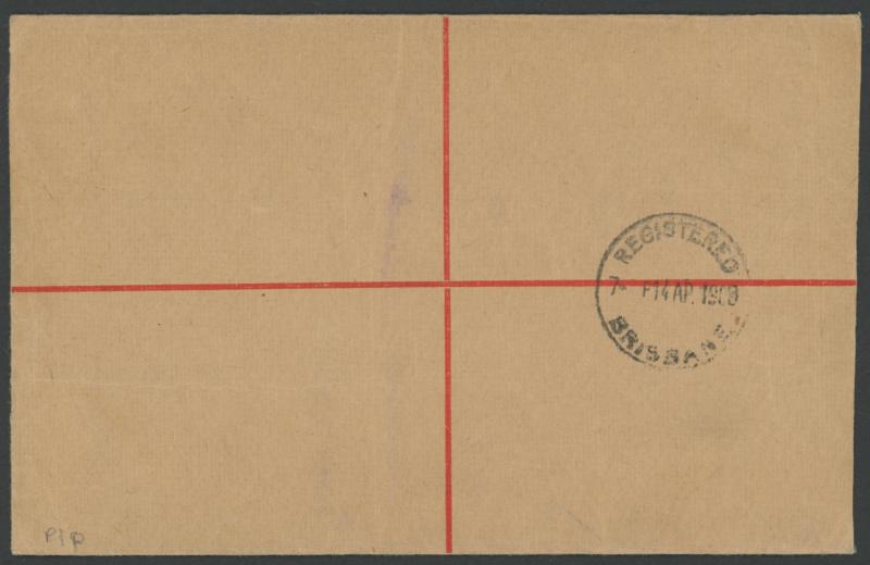 purple/blue x2 & 5d brown added tied by 'REGISTERED/BRISBANE' cds in blue as is the two strikes of the rare 'A.R.'-in capsule handstamp, scarce red & black/white R label (marginal example!), the reverse with three Correspondence Club labels, San