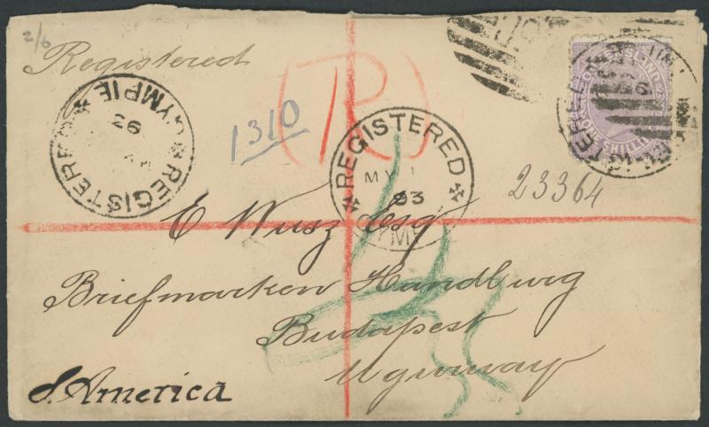 1893 cover to "Budapest/Uguraway" [sic] with rare franking of QV Second Sidefaces 1/- violet SG 174 tied by 'REGISTERED/GYMPIE'