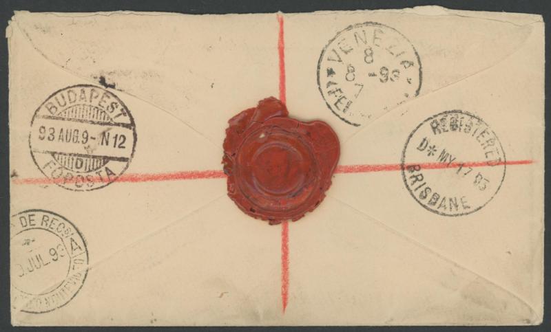 cds, at Brisbane the address construed as "Uruguay" & endorsed "SAmerica" with Montevideo arrival backstamp of '9JUL93', re-forwarded to Hungary via Venice (backstamp of 8/8-93) with 'BUDAPEST/93AUG9/FOPOSTA' arrival alongside. An oustanding