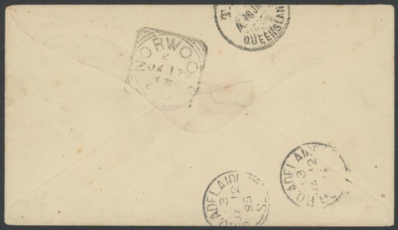 Gregory/President", to South Australia with 'TPO/A---/QUEENSLAND' & Adelaide transits and 'NORWOOD' arrival backstamp, very minor blemishes. A most unusual free-privilege cover. Ex Bernie Manning: sold for $359 (Sale 234 Lot 57). Sir Augustus Charles