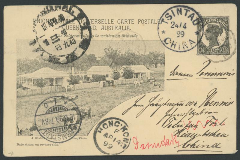 1899 QV 1½d Postal Card ('A Western Station' view) to "Tsintau Fort/Kiau-tschou/China" with 'HONG-KONG' transit cds, 'SHANGHAI'
