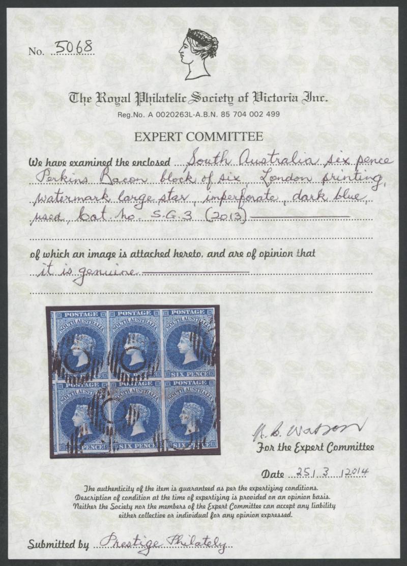 units have full margins, circle-in-bars cancels of the GPO, Cat £1080+ for singles. Ex Don Pearce: sold for $718 (Sale 249 Lot 1017). Michael Blake's very fine block of 6 with full margins sold for $3145 (Sale 148 Lot 1051). (Image1) (Image2)