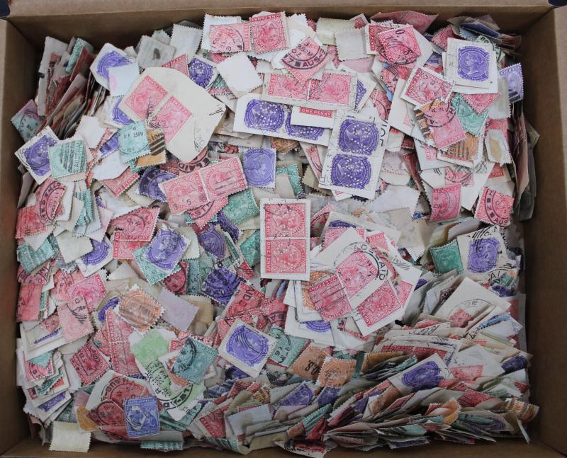 Bundleware 1880s-1900s issues on and off-paper including 'OS' punctures & overprints. Weighs 1kg.