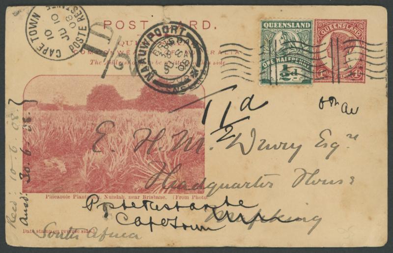 green added tied by Brisbane machine, 'NAAUWPOORT/JU 8/08' arrival cds where re-directed to "Poste Restante, Capetown" and "T ½d" manuscript for this service all on the face, 'CAPE TOWN/JU10/08/POSTE RESTANTE' cds with '½D' large unframed handstamp