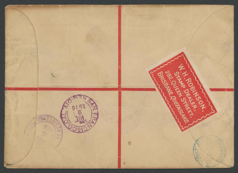 handstamp in violet & '28537' registration number on the face and San Francisco 'JUL/2/1916' arrival backstamp, a few minor bends lightly affecting one of the 6d stamps. The rate was 2½d per ½oz foreign letter x4 plus 3d registration fee. (Image1) (Image2)