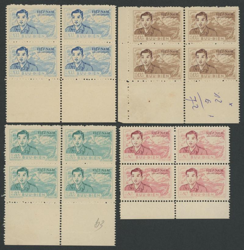 NORTH VIETNAM: 1956-57 Cu Chinh Lan Commemoration (Officials) 20d to 3000d SG NO56-59 marginal blocks of four, 100d with pen