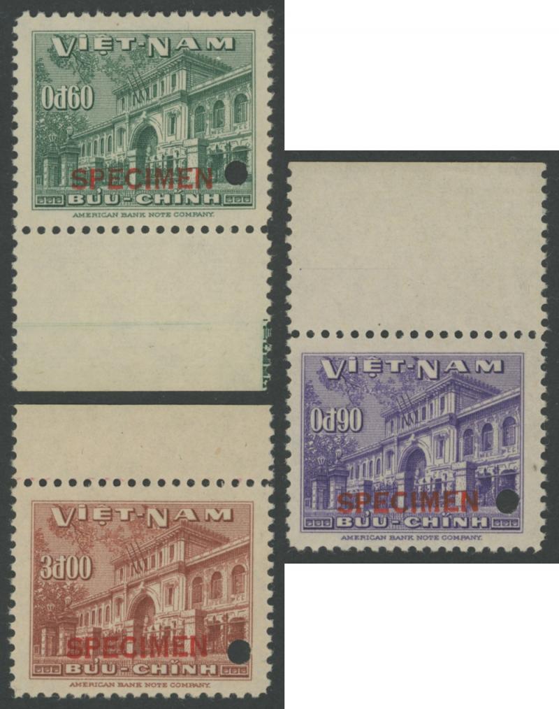 SOUTH VIETNAM: 1956 UPU Anniversary General Post Office 60c green, 90c violet & 3p red-brown set SG S11-S13 marginal singles each