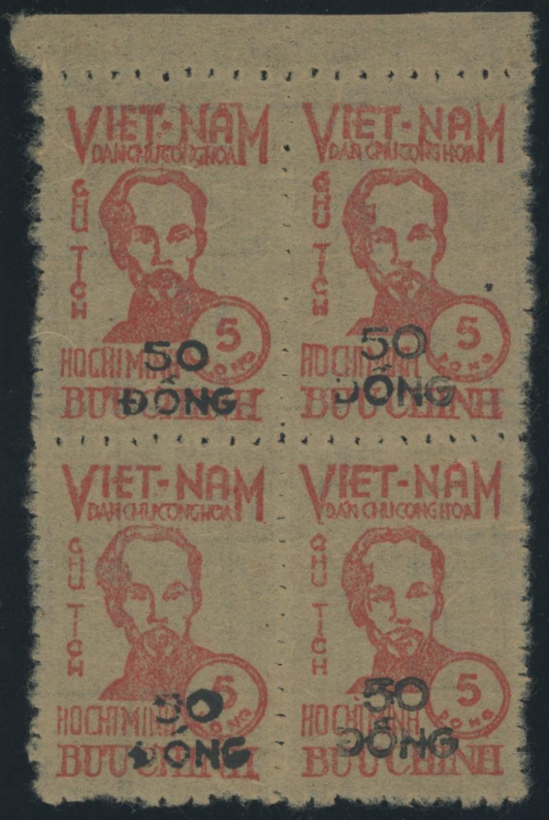 NORTH VIETNAM: 1956 Ho Chi Minh '50/DONG' Surcharge on 4d red SG N61 marginal block of 4 from the top of the sheet, also the