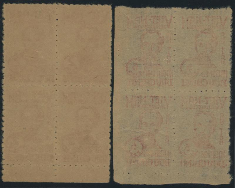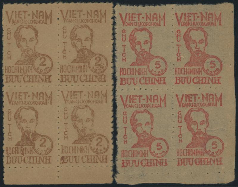 original Tongking issue 1948 Ho Chi Minh 2d light brown & 5d vermilion SG N2 & N3 each in marginal blocks of 4, centring variable & characteristic rough perfs, no gum as issued, Cat £520+ for singles.