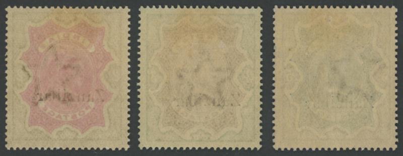 1895-96 Overprints on India QV 2r carmine & yellow-brown, 3r brown & green and 5r ultramarine & violet SG 19-21, well-centred, very