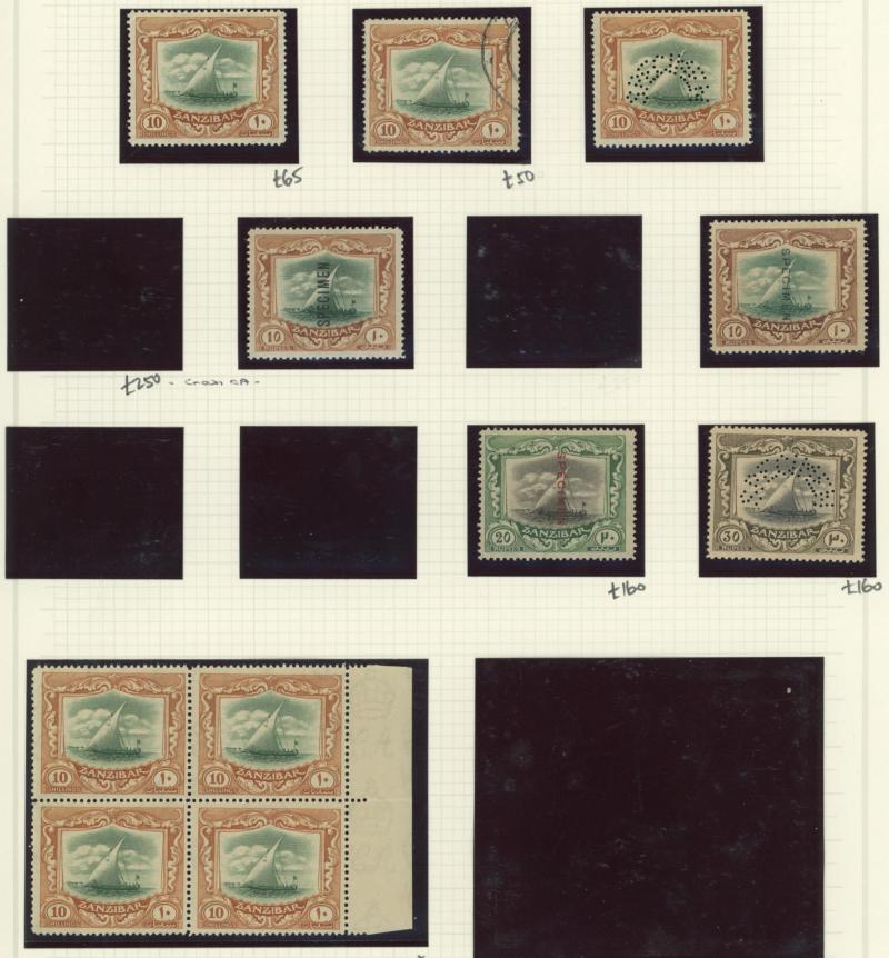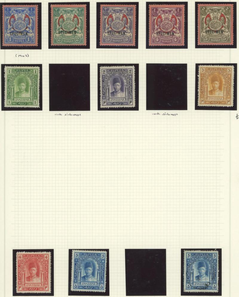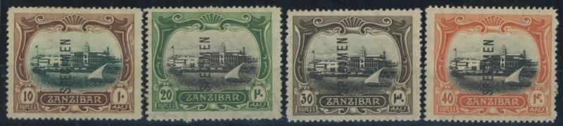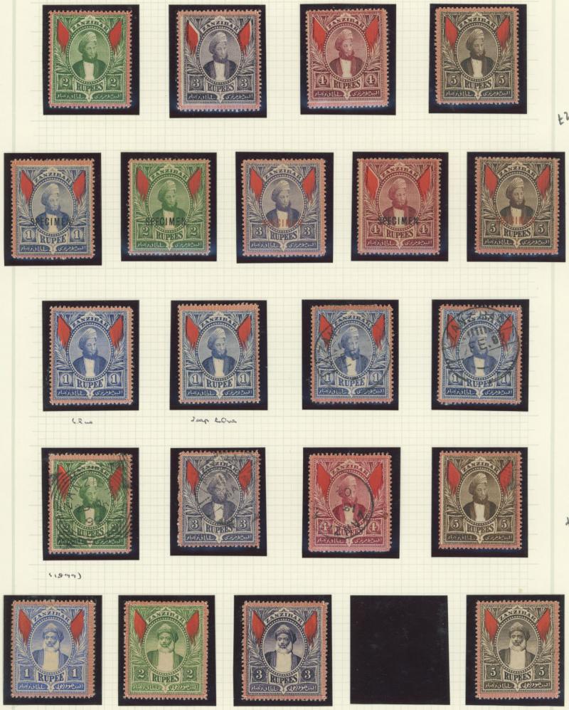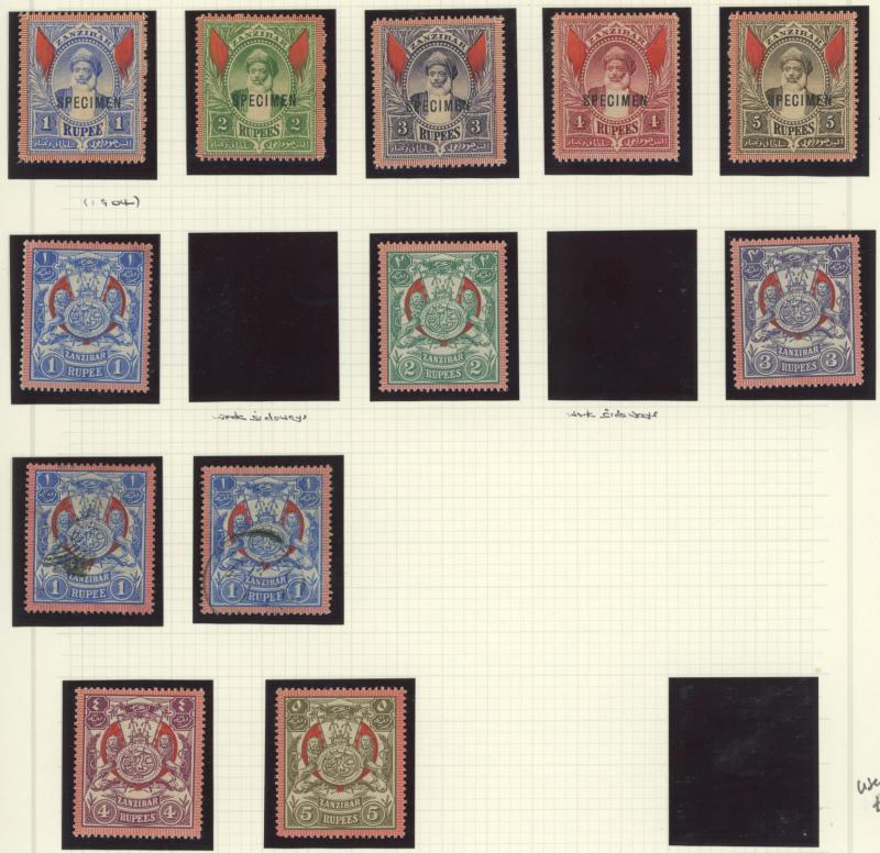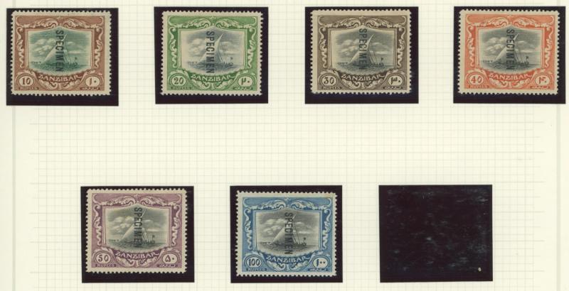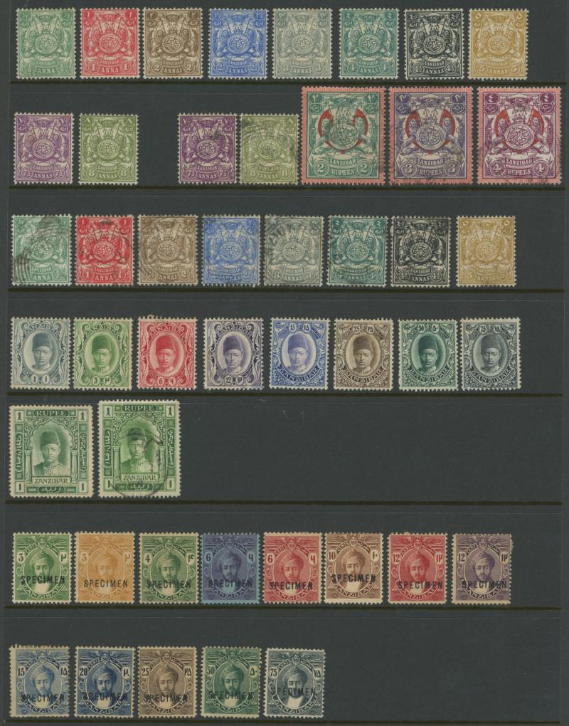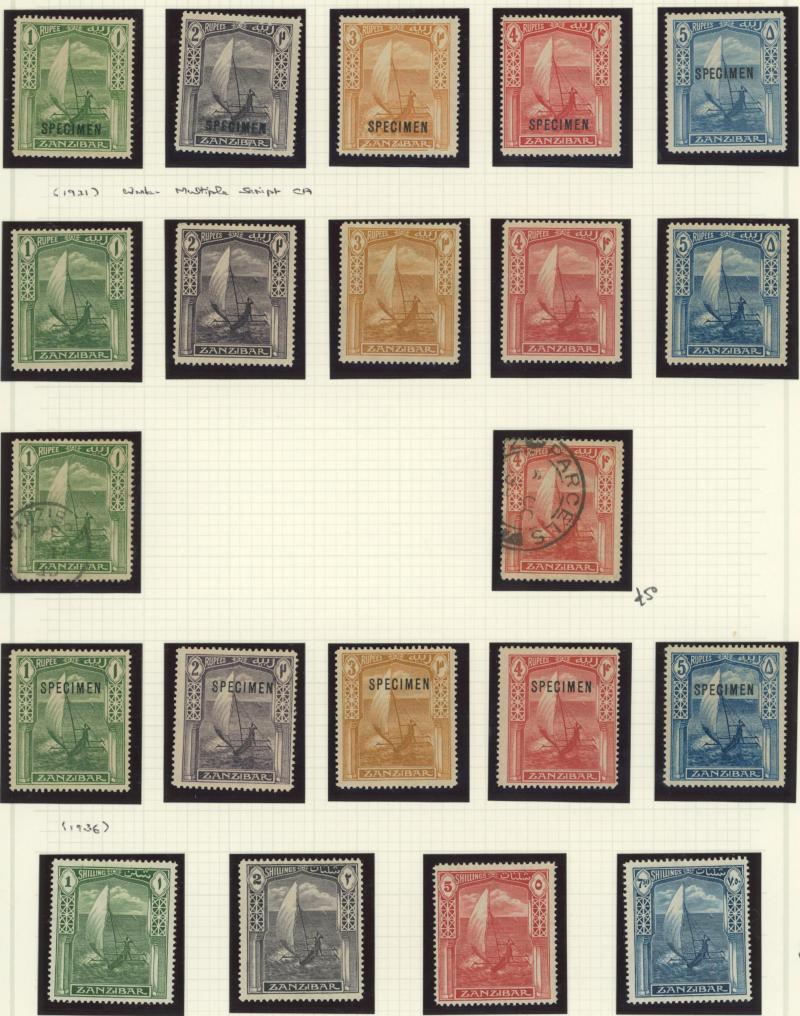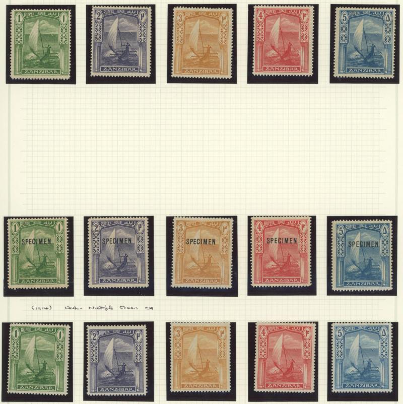 10r to 200r 'SPECIMEN' overprints, 1914-22 Multiple Crown CA Wmk Canoe 1r to 10r * & 'SPECIMEN' overprints, and 1921-29 Multiple Script CA Wmk Dhow 1r to 5r * plus 4r & 10r used and 'SPECIMEN' overprints large-part set from 3c green & 3c orange to
