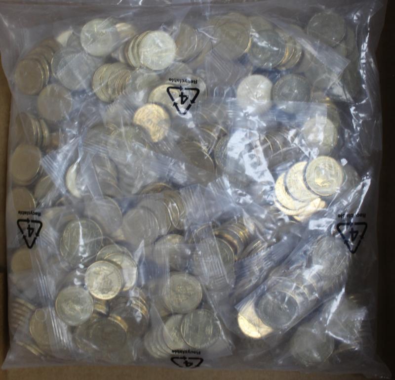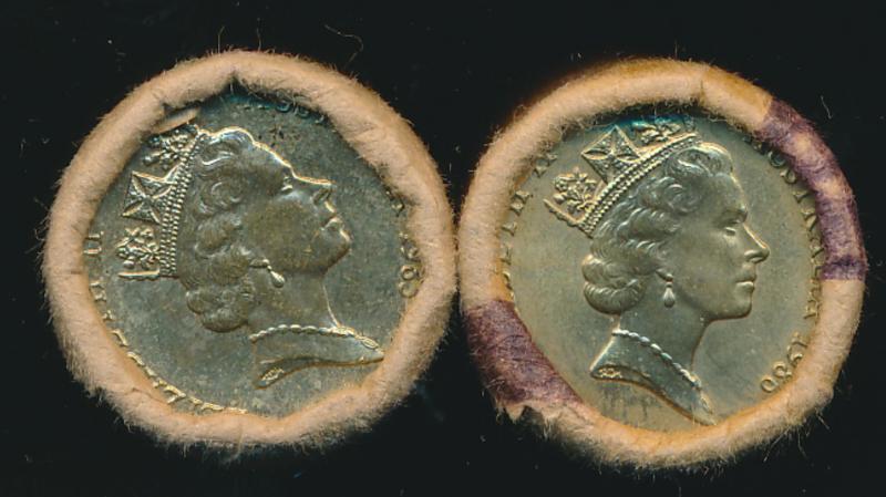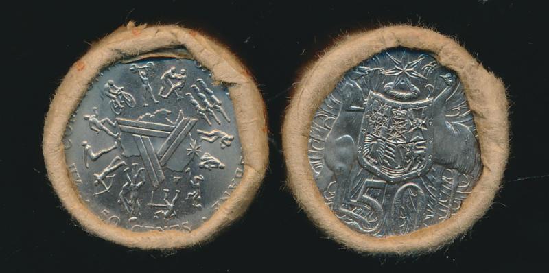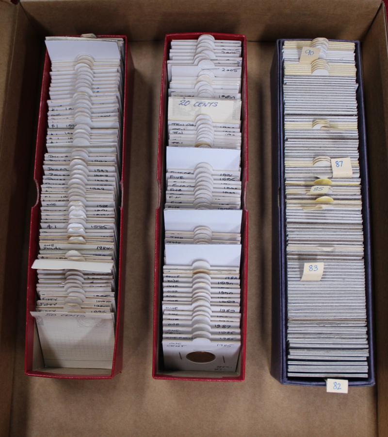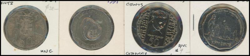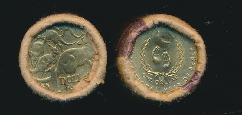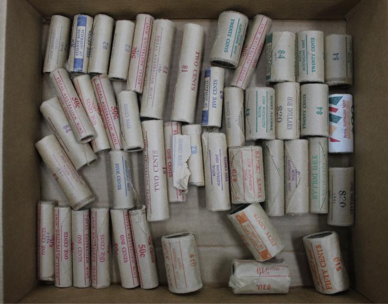 ($4) 1980 x2, 1981 x2; 50c ($10) 1979, 1980 x2, 1981, 1982 x3; $1 ($20) 1984 x2, 1986, 1988; and $2 ($50) 1988 x2; some paper wraps aged, all Unc. Weighs 10kg. (50 rolls, 1780 coins) (Image1) (Image2)